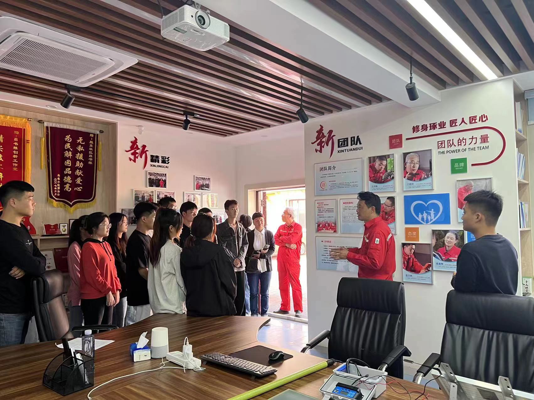 学习中,毕业生积极参与问答,对物业管理中的具体工作又有了进一步认知。现场参观学习中,胜利玉山物业技师工作站徐升春主任技师,带领学生们参观吕书栋创新工作室、成果孵化室、电工技能培训室、技能人才培训室等。