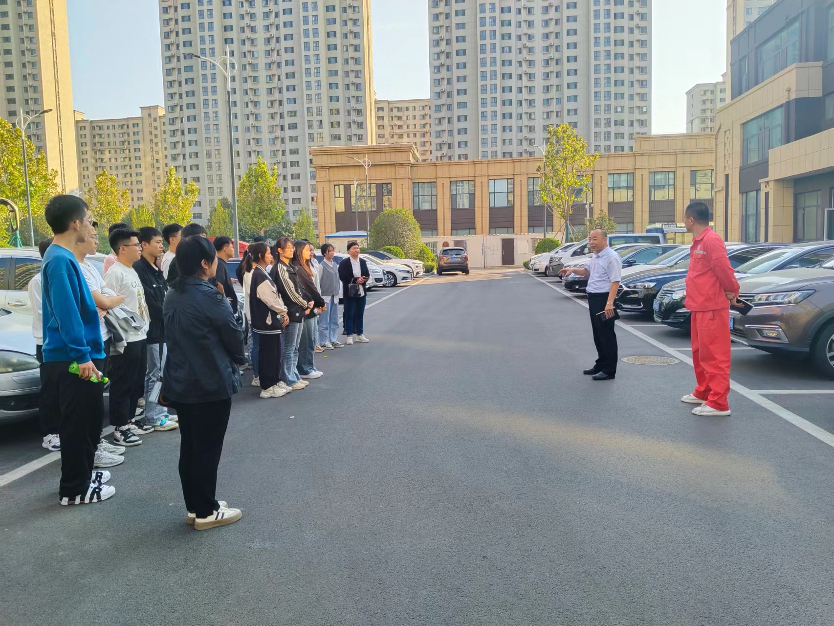 学生们注视着墙上的几个大字:“新手走进来,高手走出去”,心中满怀期望,希望自己也能尽快走进工作岗位。随后,同学们又来到了胜利玉山物业服务的樱花园小区,项目部经理窦典波带领学生们对物业小区的物业客服接待室、物业小区监控室、物业小区地下车库等进行了参观学习。