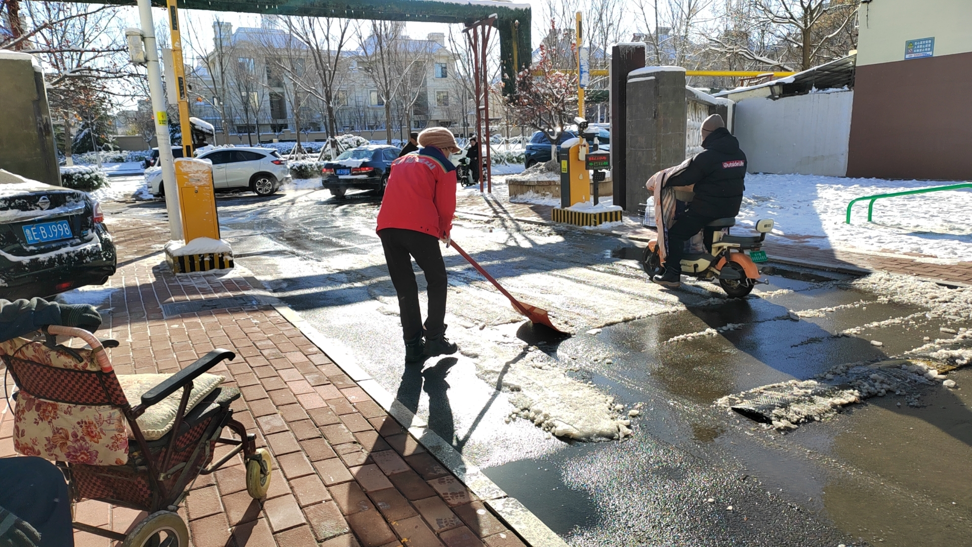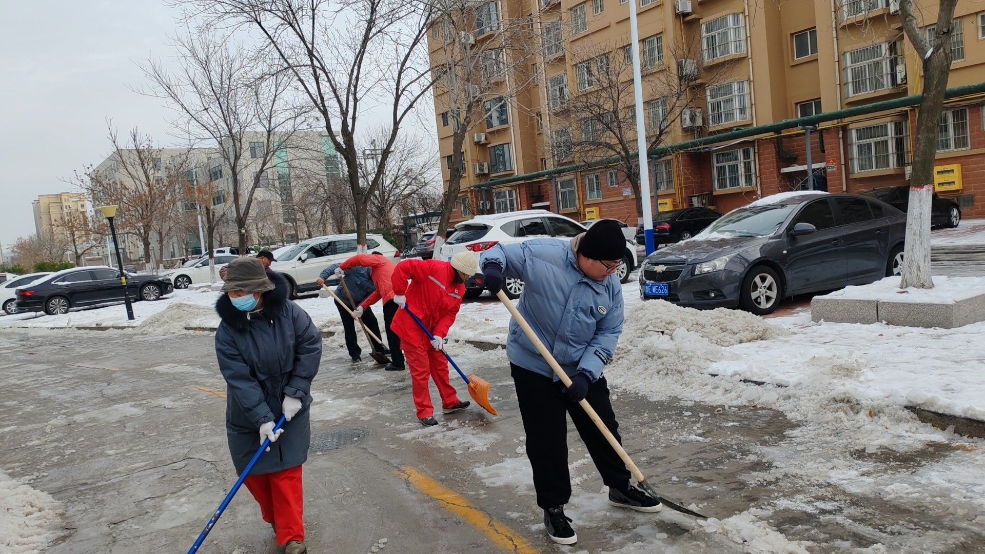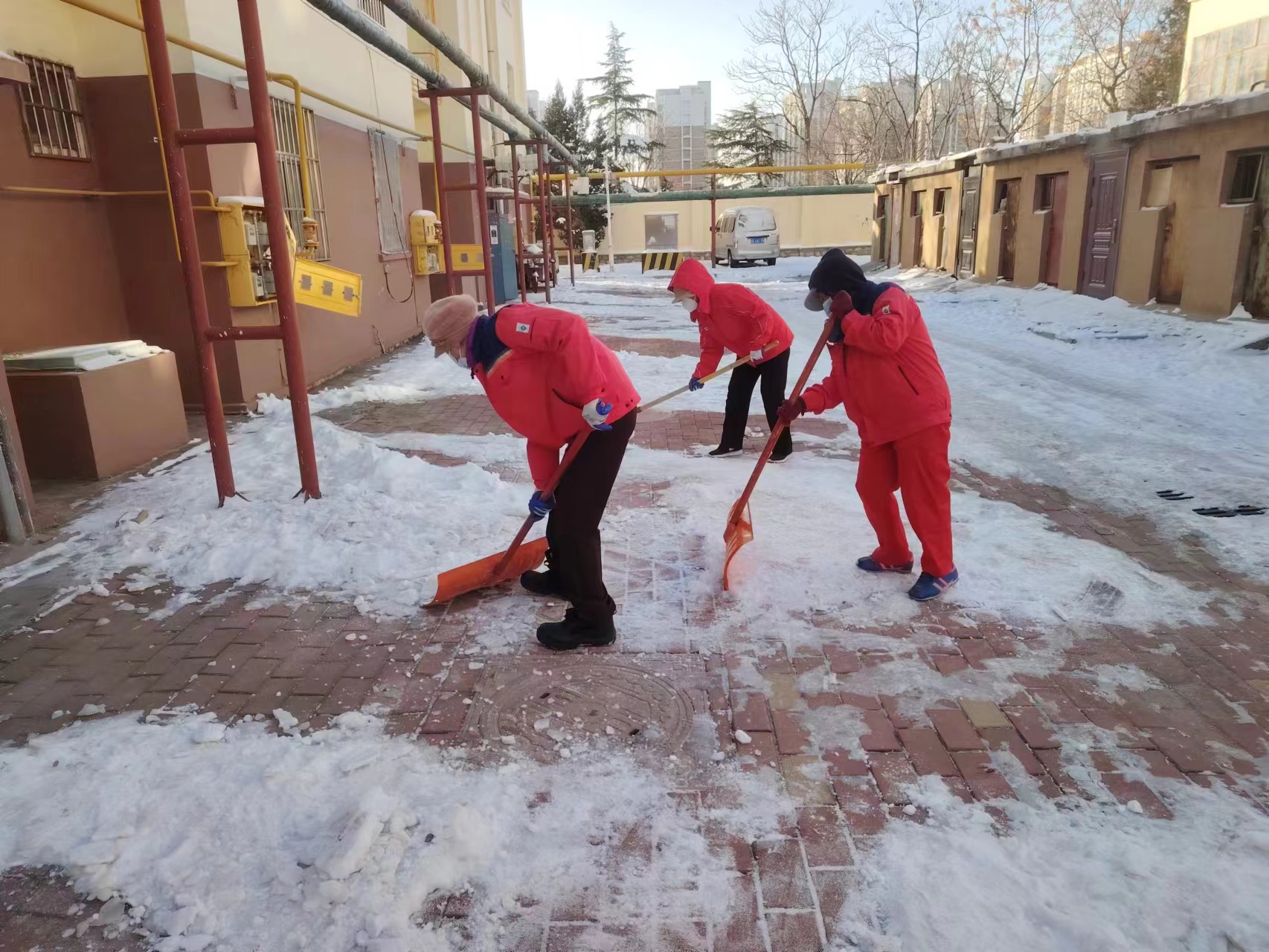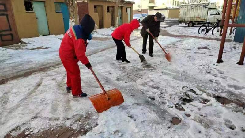 因为气温过低、湿度大,14号的一场大雪,瞬时被冰冻在了地面上。尽管从15号早上6点起,员工就在各小区里除雪,但成效不大。各个小区依然处于白茫茫一片。为此,辛兴事业部员工放弃双休日的休息时间,在各个小区内的主干道上撒上大把大把的融雪剂,然后在用铁镐凿、铁锨铲等,一点点的清理地面的积雪。