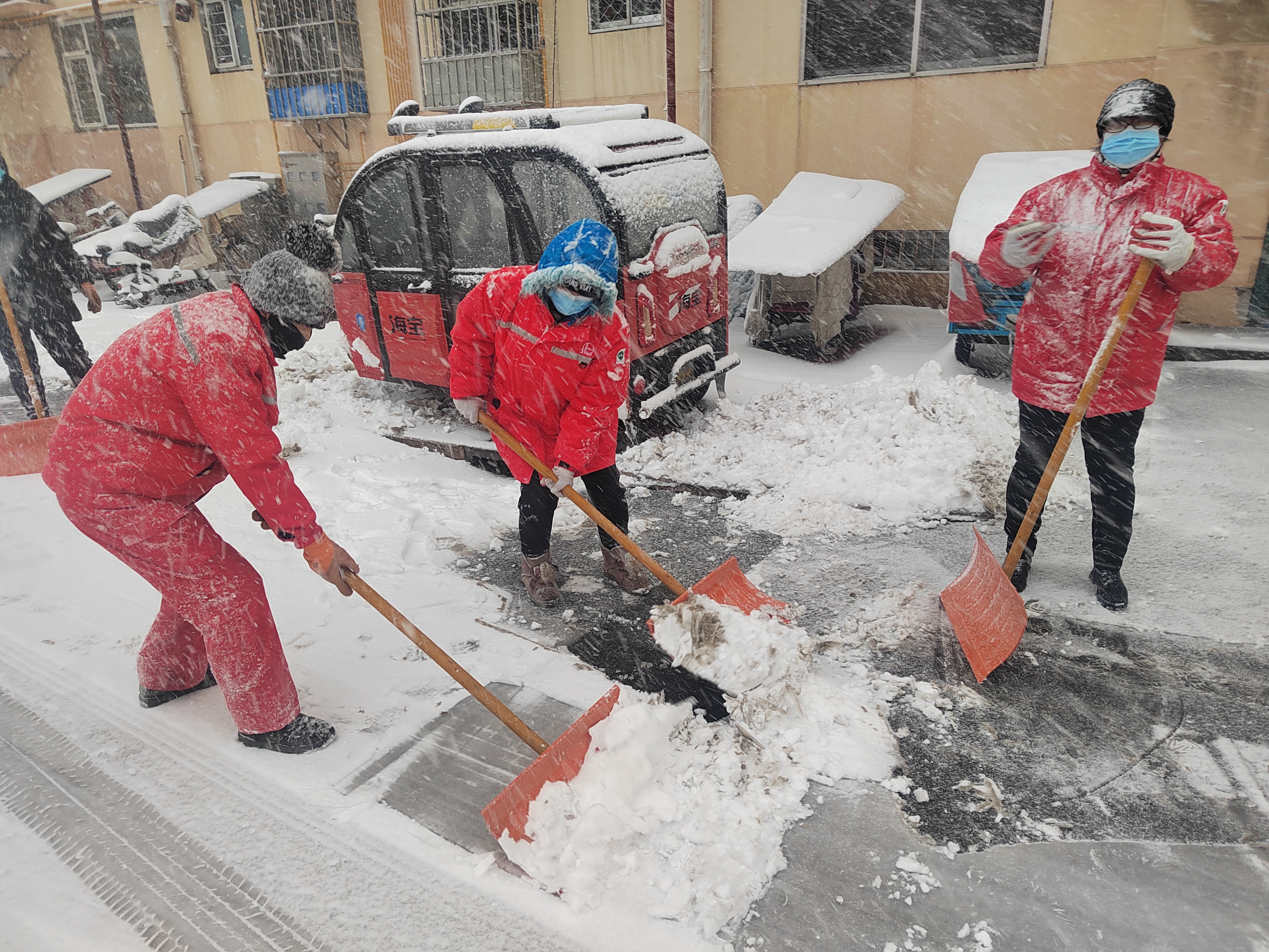 胜利玉山物业德州分公司所在地德州市临邑县的雪从上午10点多开始下,中午时分已经变成暴雪。下午2点,积雪厚度已经达到10多厘米,雪势丝毫没有缓和的迹象。看着来往的车流不断碾压着积雪,宏宇项目经理陈建开始担心:傍晚时分加速降温会让积雪迅速结冻,压实的雪面第二天就会变成“溜冰场”。多年的工作经验让他此刻不得不作出决定:不能等了,全体集合开始清雪!