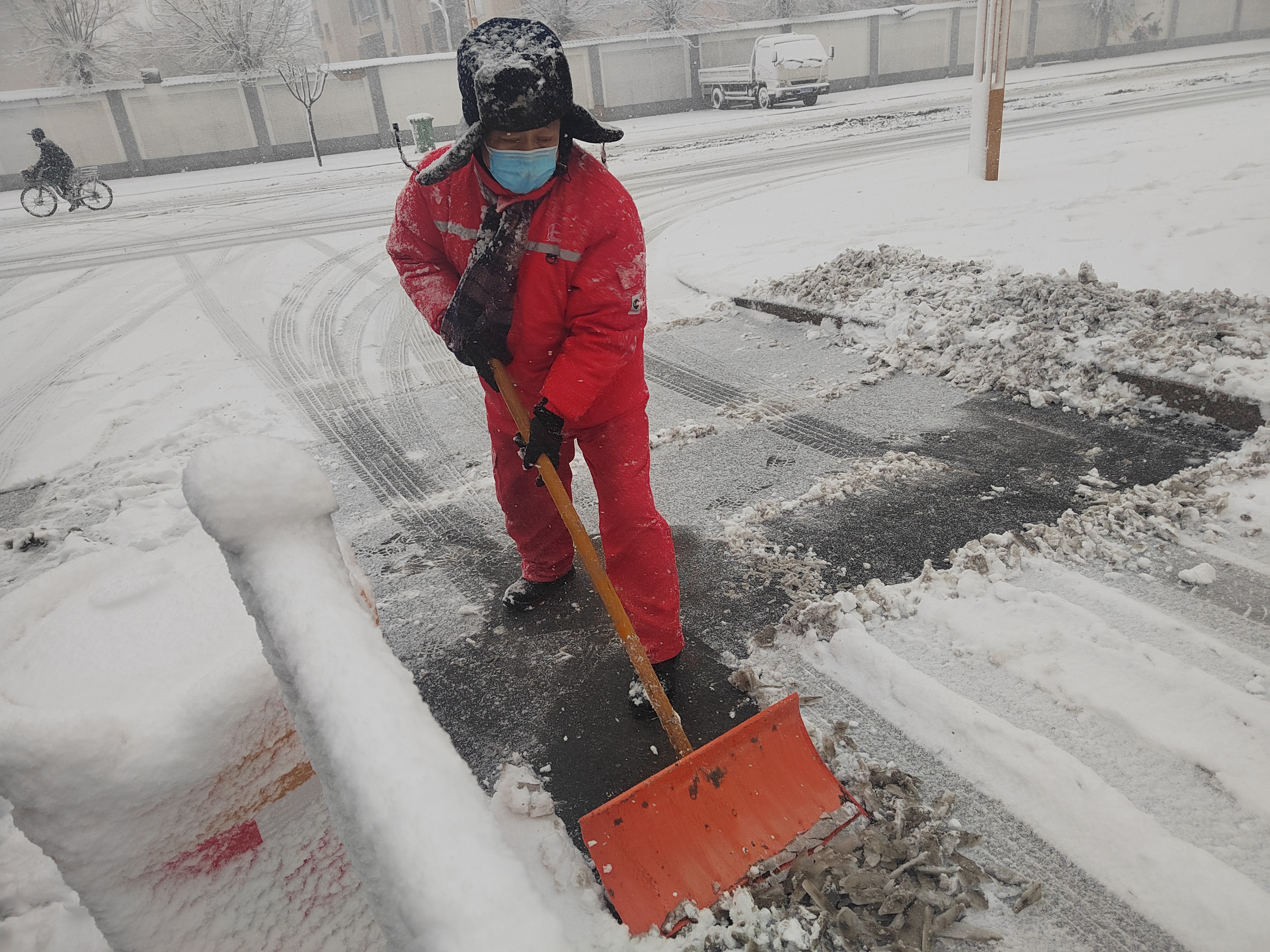 事业部快速集结了10余人的队伍,从小区大门沿着主路开始行动。雪势仍很大,积雪没过了鞋面,雪吹到脸上睁不开眼,鲜红的工服很快渐变成白色。尽管如此,每一个物业工作人员都清楚,趁积雪还比较松软尽快开辟出一条人行道保障居民出行,否则地面危险程度和除雪的劳动强度,随着寒潮降温将不断增强。现场没有任何言语,混合着风声、铁锹摩擦地面声,下午5点,除雪已经进行了3个小时,期间不少职工都摔了好几跤,1米8的大个子陈建也已经有些疲累,但大家干的依然热火朝天。下班高峰期一过,陈建又立即组织大家对压实的雪面进行撒盐融雪,为第二天的除雪做准备。