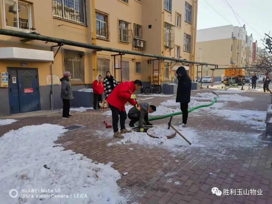 杨建峰与项目副经理魏忠立即赶到钱阿姨家查看情况。发现是因天气寒冷导致下水管里的污水结蜡造成堵塞。杨建峰立即通知维修人员王师傅带着疏通机到钱阿姨家进行疏通。