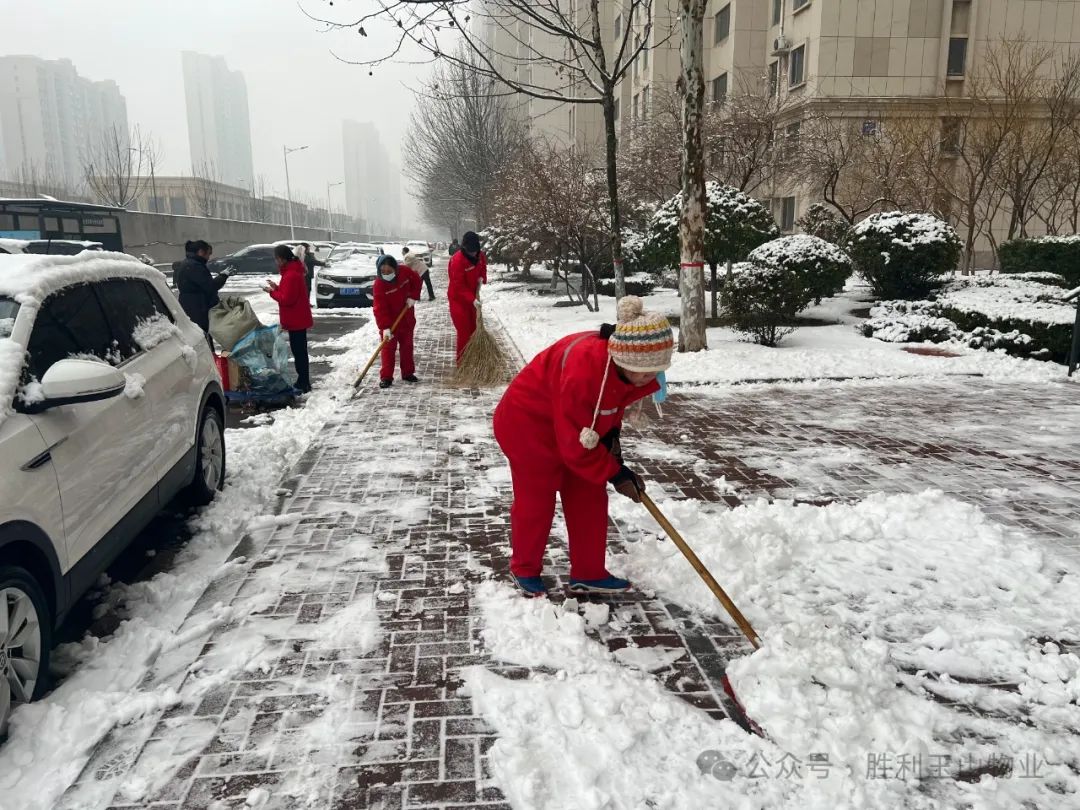 面对突如其来的大雪,胜利玉山物业迅速反应,立即启动扫雪预案,各事业部的工作人员在17日天未亮之前就已整装待发。他们知道,这场雪不仅仅是一场自然灾害,更是对服务质量。