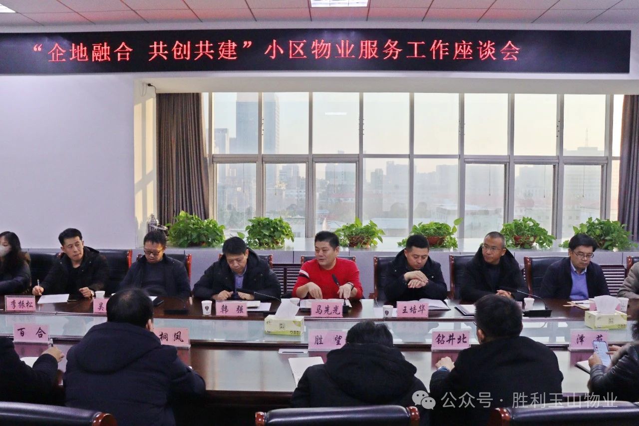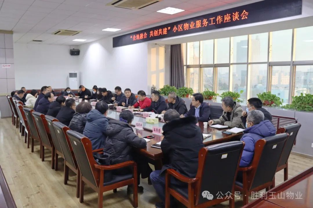 1月25日下午,一场以“企地融合做典范,同创共建促和谐”为主题的物业服务工作座谈会在辛店街道七楼会议室召开。东营区辛店街道人大工委主任韩强和胜利玉山物业副总经理王培华、副经理马先光、各事业部负责人、各社区书记近30人参加了座谈会。该座谈会旨在加强物业与社区街道之间的合作与沟通,共同推动企地融合,促进物业提质增效,提升辖区居民的满意度、获得感、幸福感、安全感。