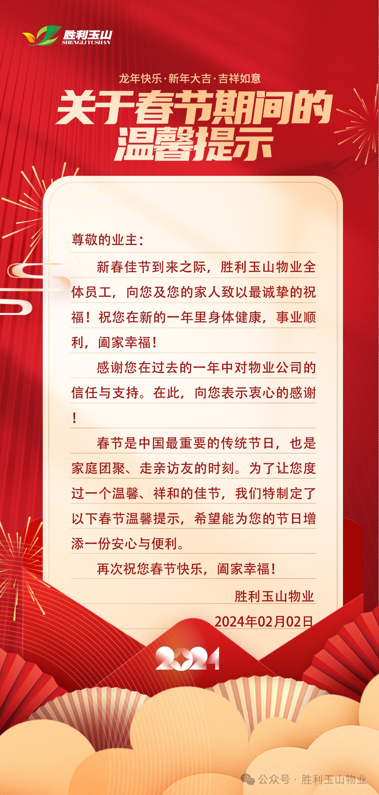 如您在春节期间有任何需求或问题,请随时联系物业客服中心8555440。我们将竭诚为您服务,确保您的节日愉快无忧。