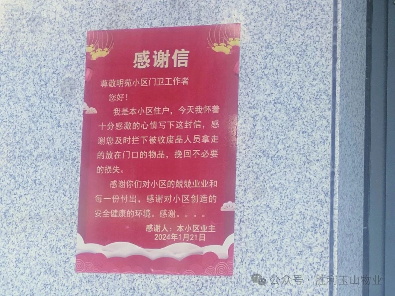 一封信,凝聚着一份满意、一份认可、一份信赖,也是对我们物业工作人员的肯定。