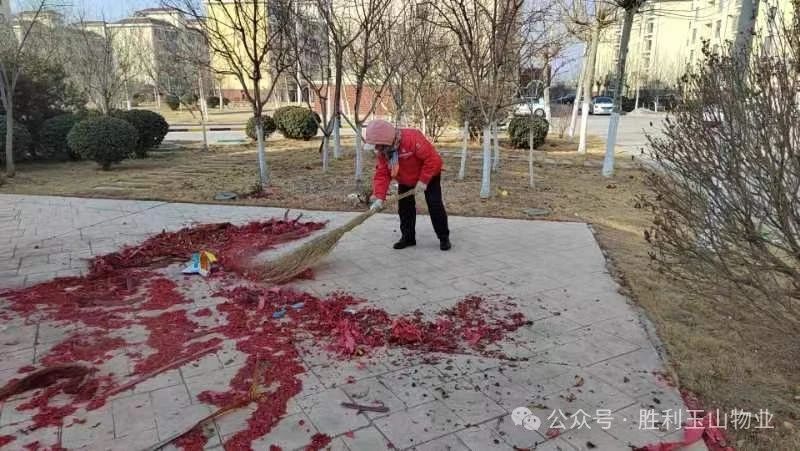 初一的鞭炮浪潮刚刚过,就看到幸福事业部物业人员,穿梭在小区的每一个角落,有得拿扫帚清扫,有的往返送垃圾,有的跨进绿化带内清理、捡拾散落的鞭炮纸屑,他们躬身弯腰,挥扫帚装袋,心里只有一个信念,那就是如何更快的扫屑去污,让路面恢复往日的干净整洁。