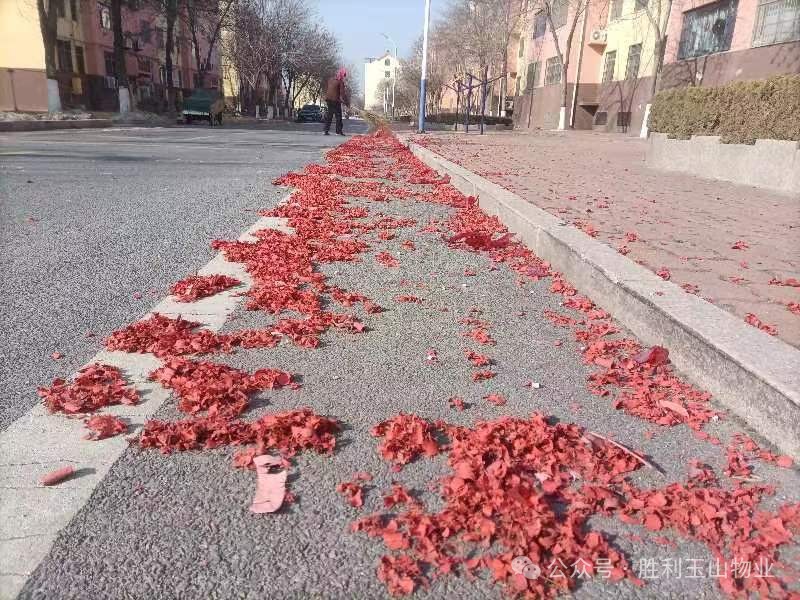 春节燃放烟花爆竹是传统节日的庆祝方式,红红火火的鞭炮纸满地飞,路面上、草坪上、小区广场、绿化带,随之鞭炮纸也给小区带来了安全隐患和环境污染,为保证小区居民生活环境,幸福事业部各辖区员工放弃休息时间,每天及时来到各小区清理鞭炮。