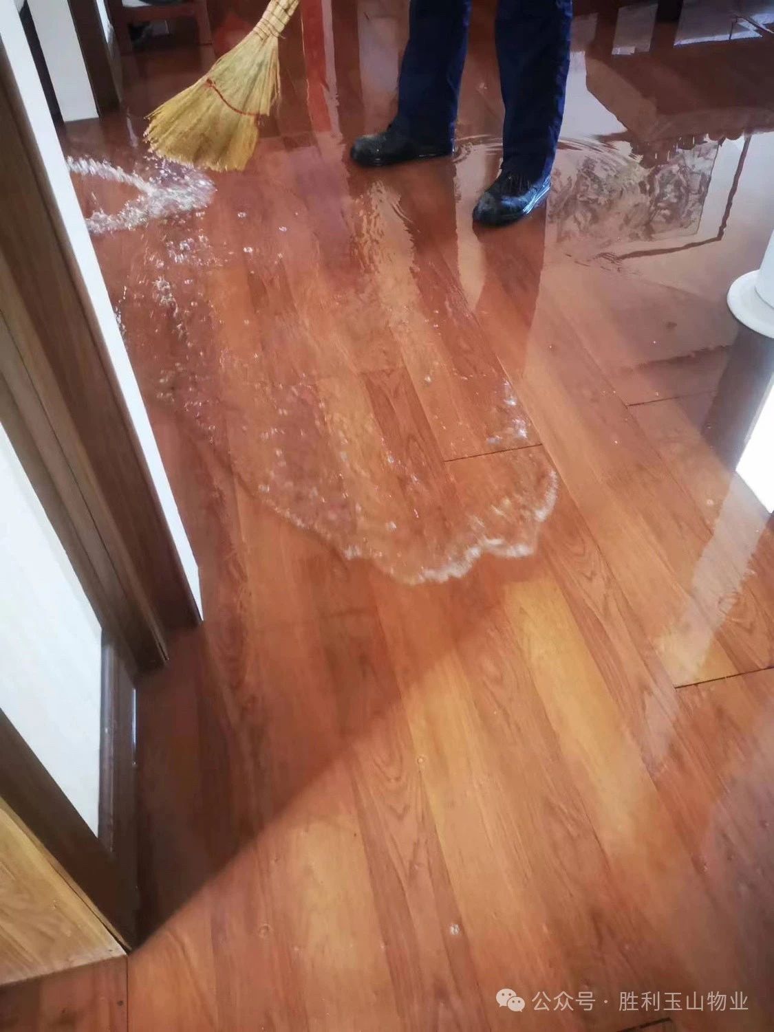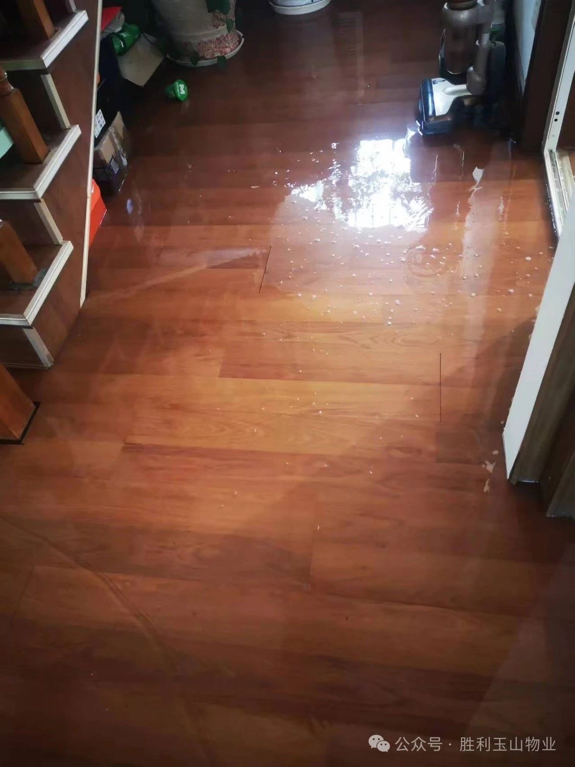 在焦急等候半小时后,业主和供暖师傅同时到达了现场,打开门的那刻,业主瞬间吓坏了,雾蒙蒙的房间,屋内一片汪洋,足足有二十公分的水深,供暖师傅看到客厅暖气片与管线接头处断裂,立即关闭暖气阀门,沈英见业主焦急,边安排物业清理积水,边安抚业主。屋内温度热,不一会物业人就干得汗流浃背,经过了三个多小时的清扫,积水总算清理完成。