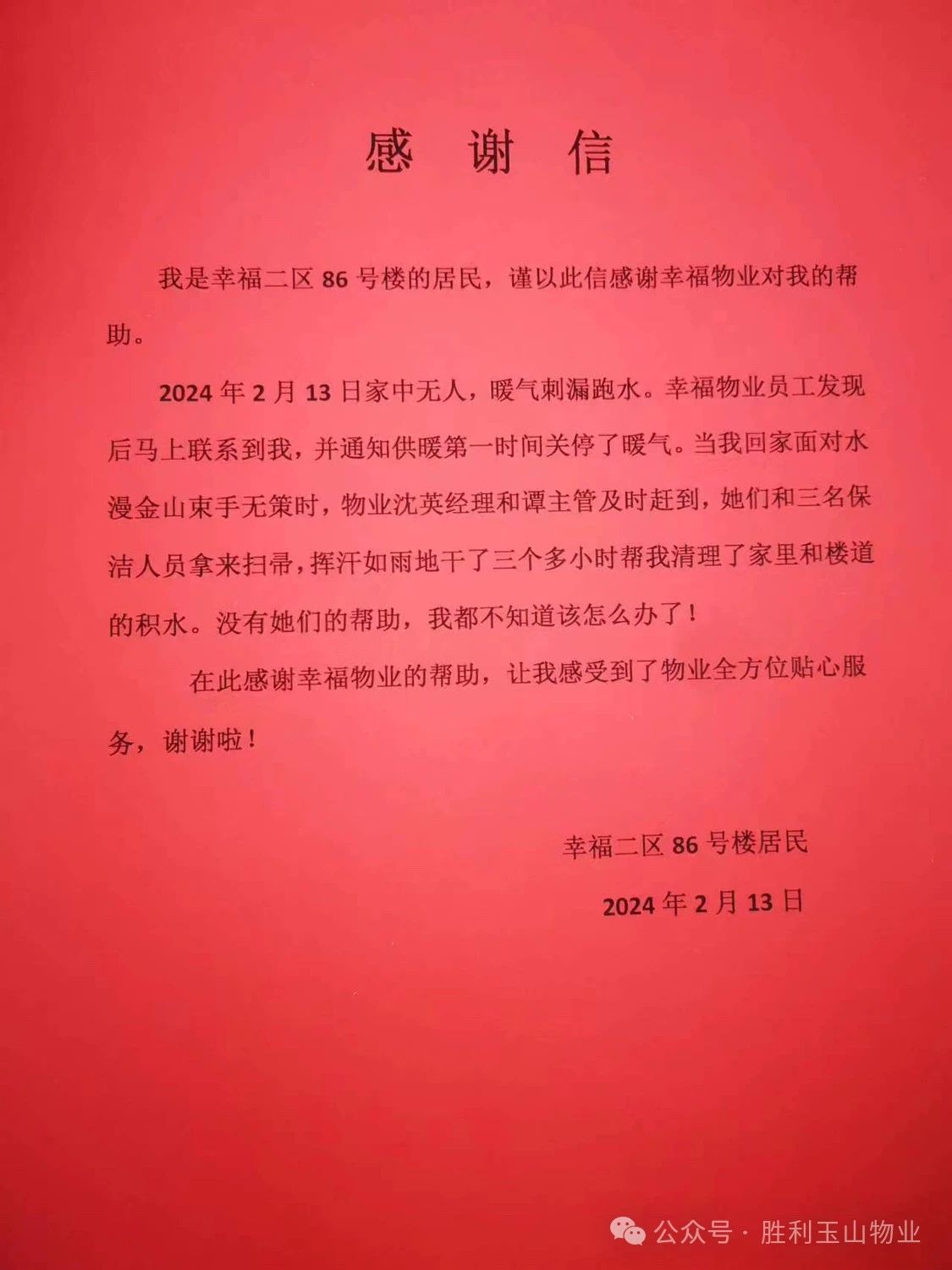 大年初四一早,幸福事业部幸福二小区保洁韩治凤大姐在进入86号楼1单元准备清理楼道时,发现楼上往楼下流水,立即给值班的谭延清打电话告知,同时急忙上楼寻找漏点,最后在4楼看到有水流出,敲门未见回应。