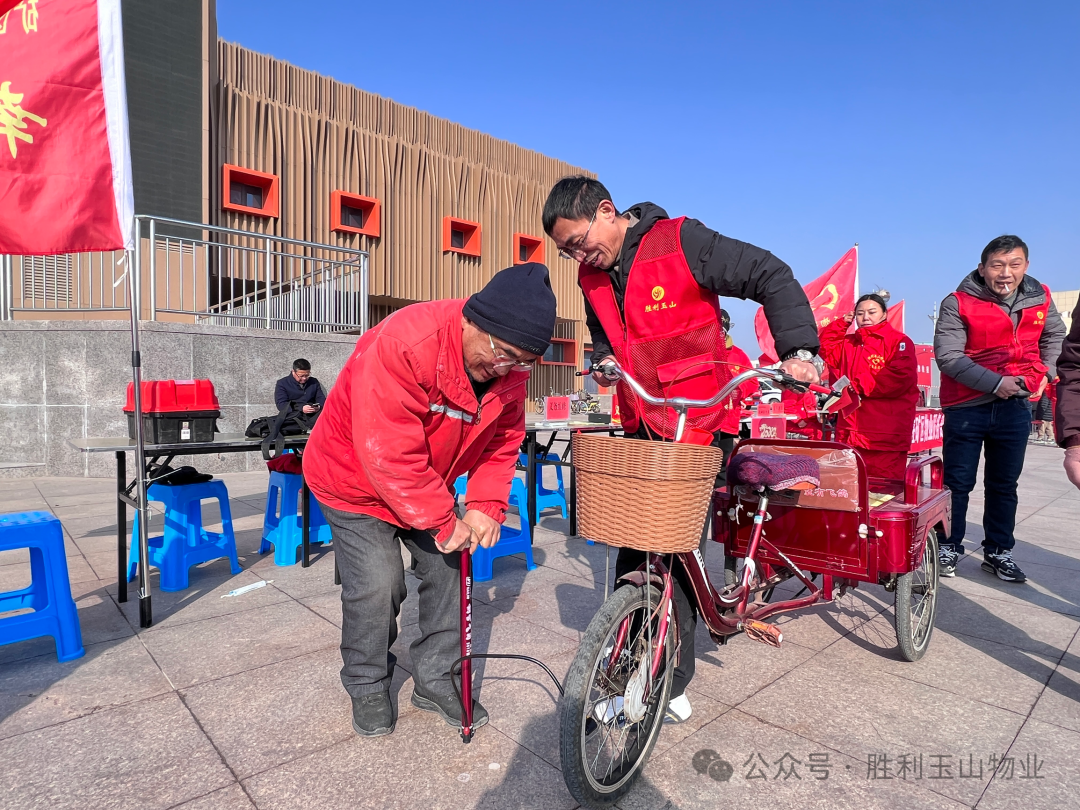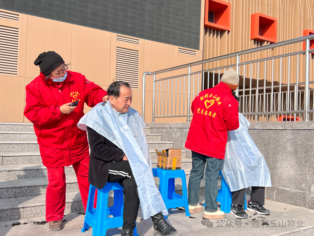幸福事业部活动区域,由综合管理室及各大厅人员10余人参加此次活动,有的给居民发放“连心卡”,热心为居民提供24小时服务及监督电话;有的在与居民沟通宣传玉山物业的政策和物业缴费的便捷方式及缴费赠送活动;最为靓眼的是物业人为广大居民提供的“义务理发”区域,因为天气的原因,只能在避风处操作,居民们排起了长队;有老人骑着三轮车来找打气筒充气的;有居民拿来了智能烧水器,找到我们物业维修师傅维修,经过检查维修,烧水器修好了,老人高兴地说半年都没用了,“就等这一天了”!说再有损坏的电器,明年一定再来找物业!