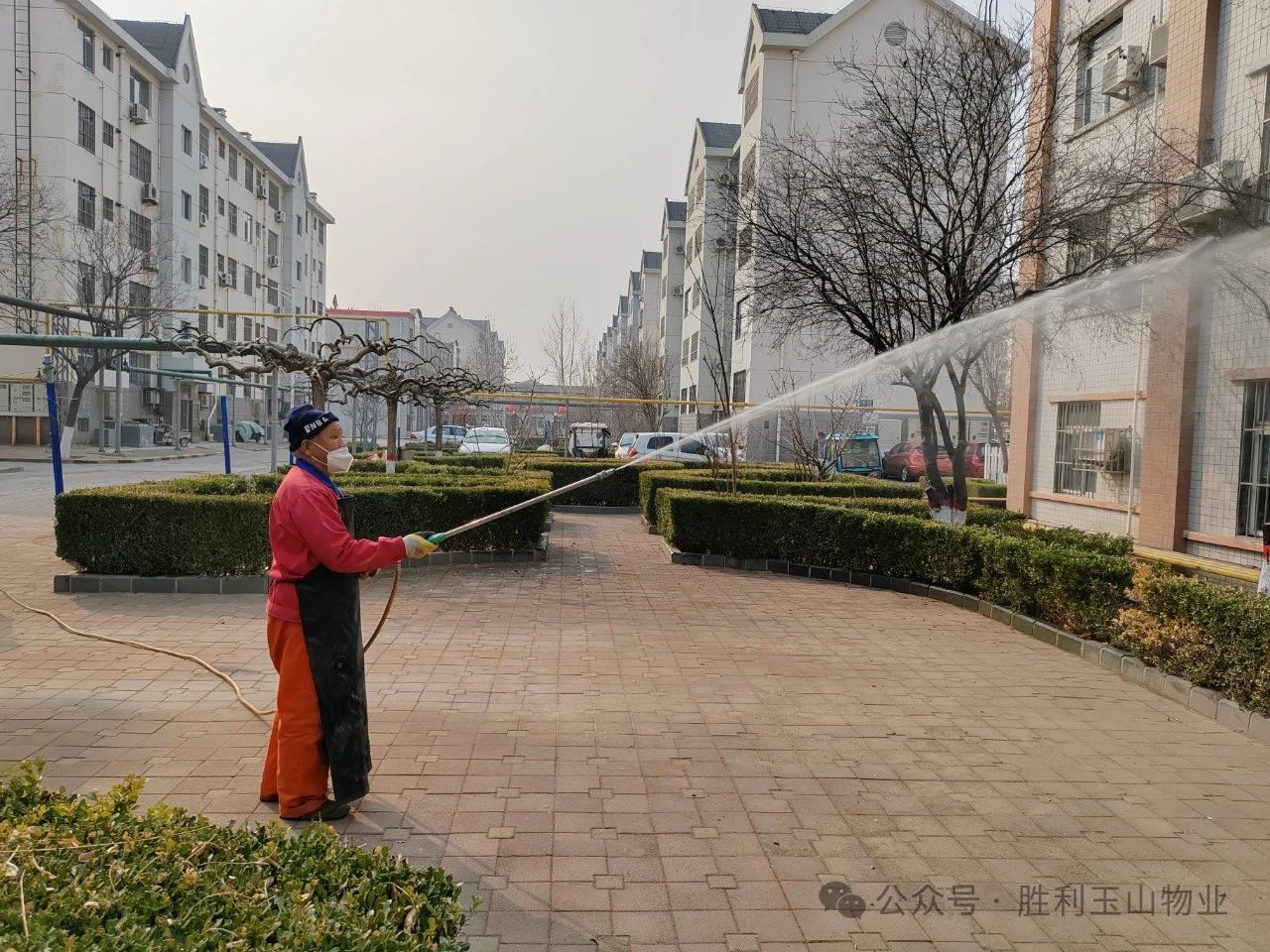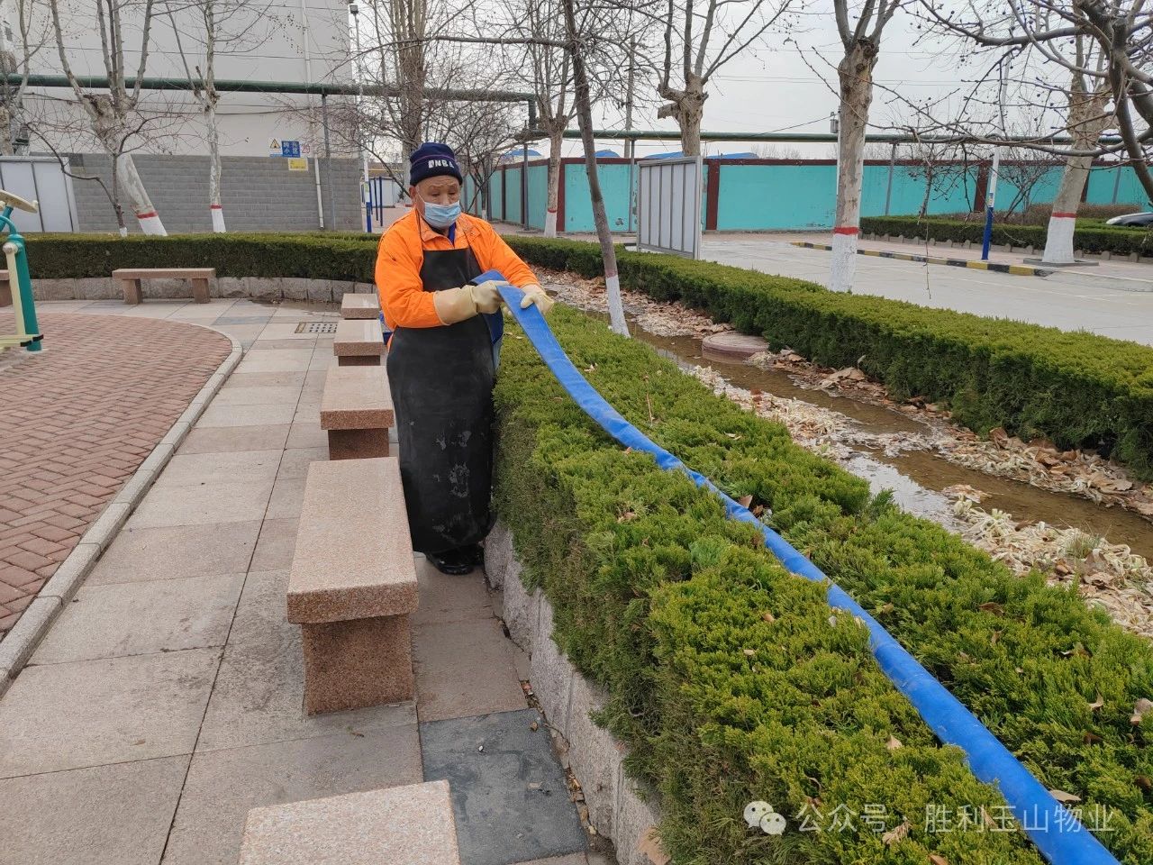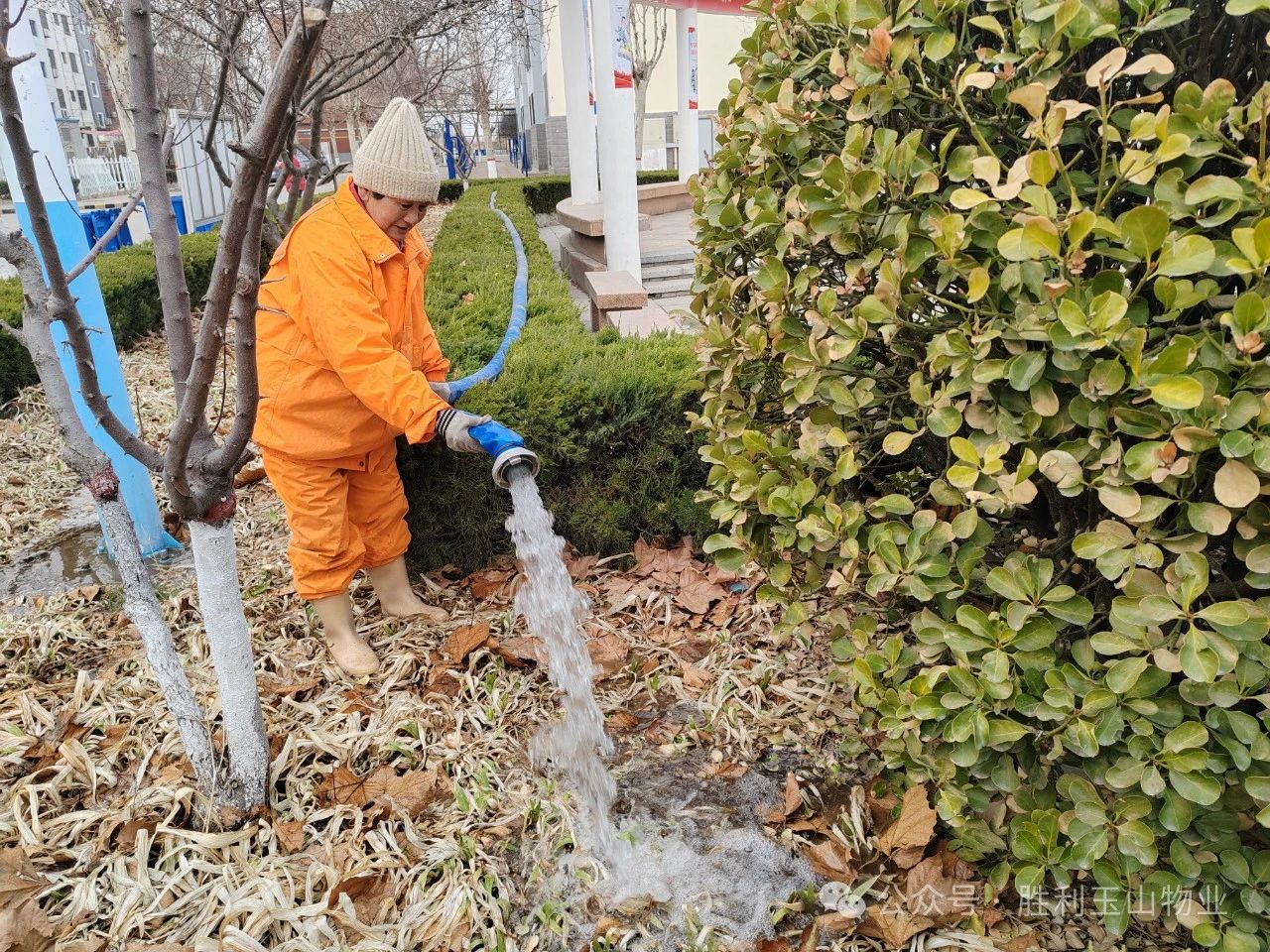 “节气不等人,春日胜黄金!”春季,植物开始萌芽生长,也是养护的黄金时期,因冬季降水较少,部分植物根系缺水,因此要浇好返青水,同时结合修剪、防治病虫害等养护管理工作,为全年苗木养护工作打好基础。在行动过程中,玉山物业博兴分公司的绿化师傅们还及时清理了在灌木中的垃圾,将灌溉植物和垃圾清理结合起来,形成长效管理机制。