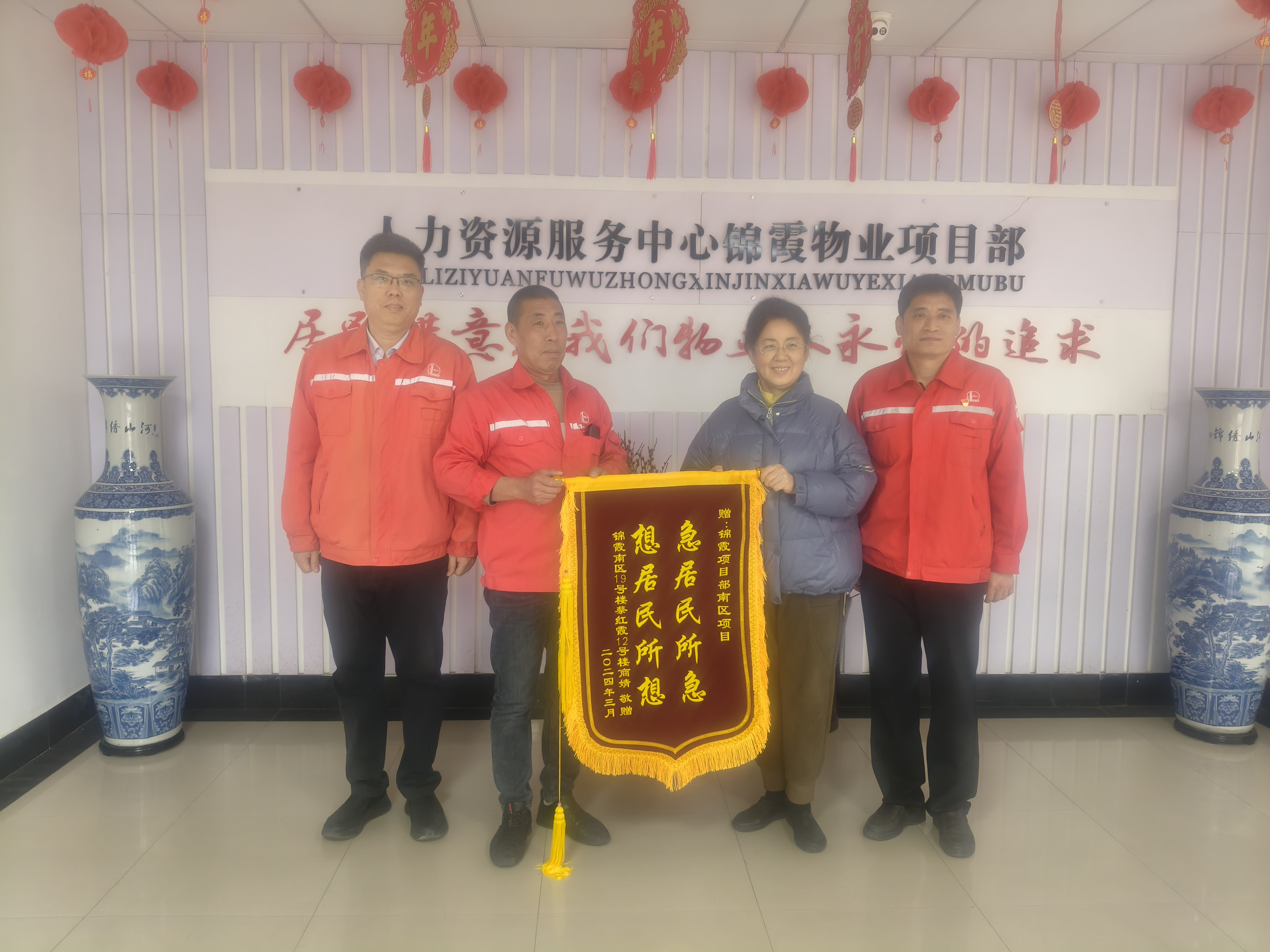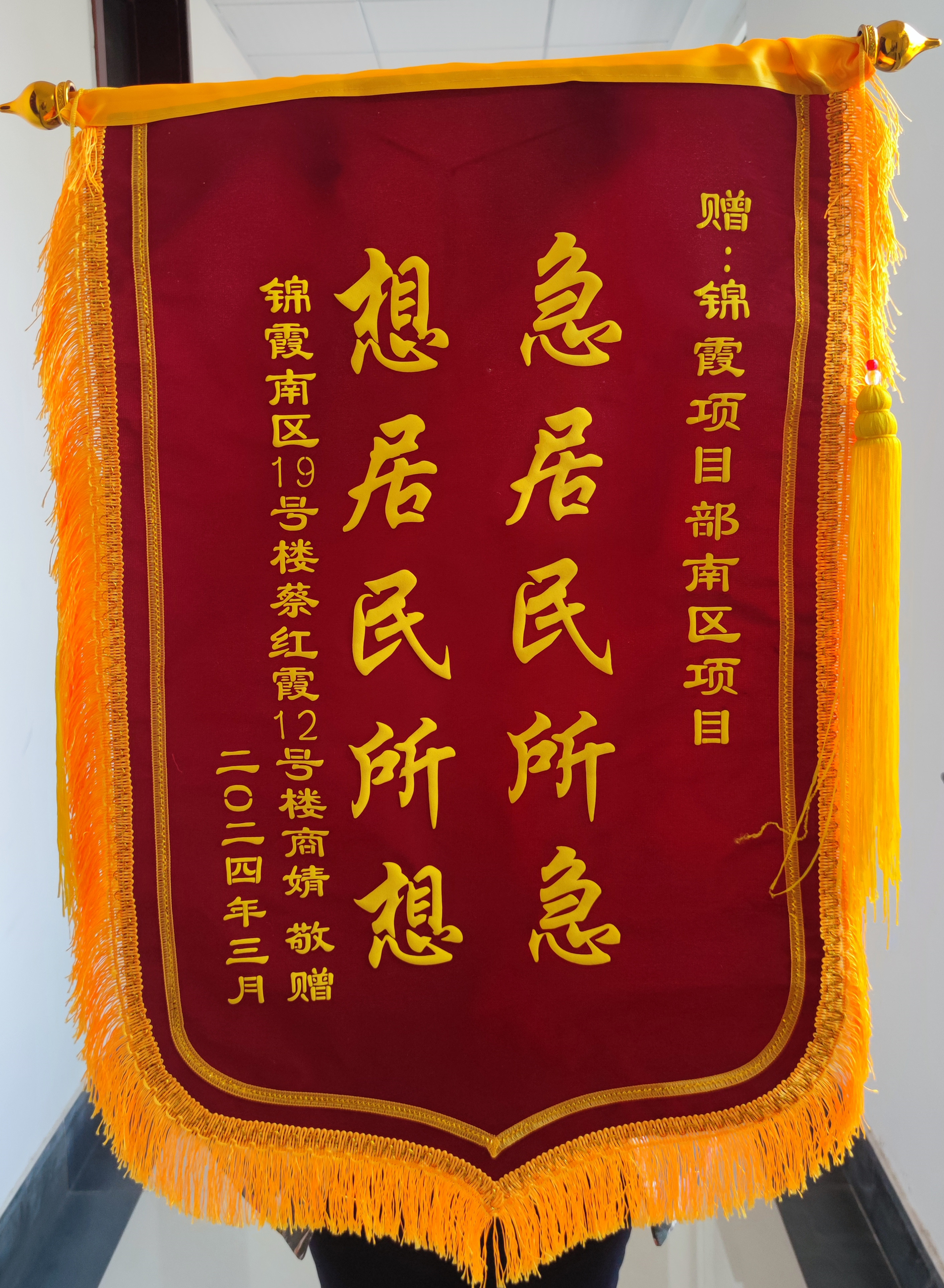 “居民满意是我们物业人永恒的追求”是锦霞事业部始终坚守的服务宗旨。各小区项目负责人在工作中都认真负责地对待遇到的任何问题,在小区管理中严格按照项目部要求开展工作,督导考核承包商现场服务质量、开展项目经理接待日活动、及时处理居民报修、协助居民申请办理住宅维修基金,并在节假日和汛期坚守岗位。他们在默默奉献中诠释着锦霞物业人的服务宗旨,正因如此才能收获来自居民的赞许。表扬的锦旗正是居民对锦霞物业人的认可,同时也是锦霞物业人工作的动力,让他们感受着双向奔赴的感动。
