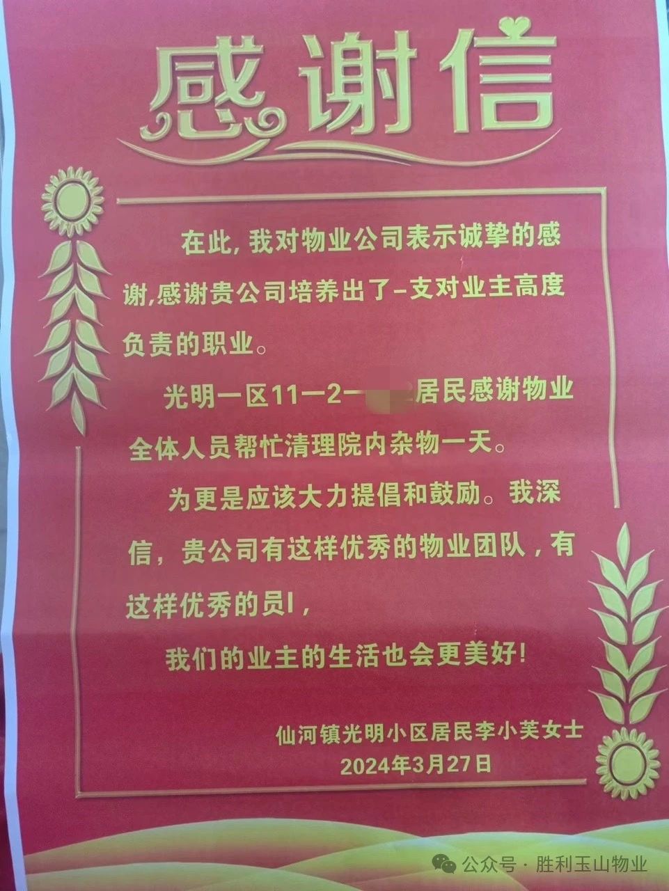 这封感谢信不仅是对物业人员辛勤工作的肯定,也传递了社会正能量,彰显了物业与居民之间的和谐关系。幸福事业部始终坚持从点滴小事做起,为居民解决实际问题,赢得了居民的深深感激与认可。此次行动再次证明了物业人与团队的优秀服务品质,为提升居民的安全感和幸福感贡献了力量。