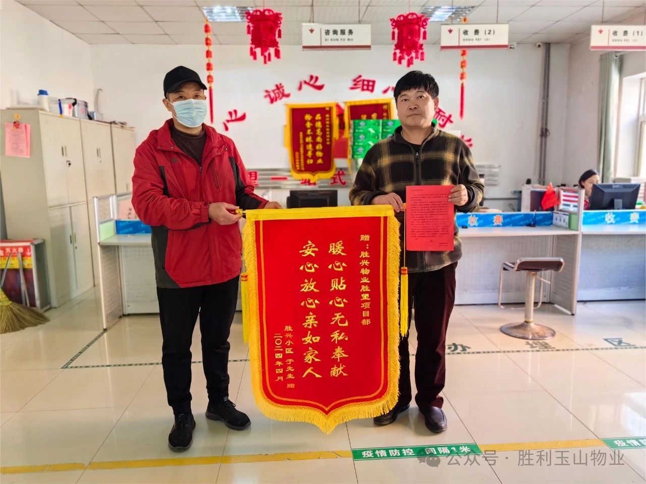 2024年4月15日上午9时,一位业主家属满怀感激之情来到胜利玉山物业胜兴事业部的胜望项目,将一面鲜艳的锦旗亲手交到了项目经理虞雪峰的手中。锦旗上醒目的两行烫金大字写着“暖心贴心无私奉献,安心放心亲如家人”,真诚地感谢物业工作人员找到走丢的老母亲。