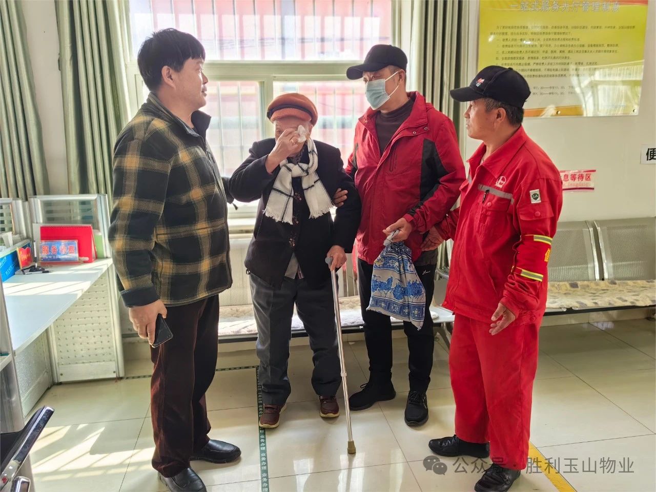 据了解,事情发生在4月11日上午。胜望项目的项目经理虞雪峰在巡查小区时,发现一位老人神色紧张,在小区内左顾右盼、不知所措。虞雪峰看着老人面生,于是关心地上前询问。经过交流,虞雪峰了解到老人已经97岁高龄,记不清家庭地址,身上也未携带手机或身份证。于是,他先将老人搀扶回物业站休息,并安抚老人的情绪说:“您先喝点热水,休息一下,不要紧张,我们正在想办法联系您的家人,一定会安全送您回家的。”