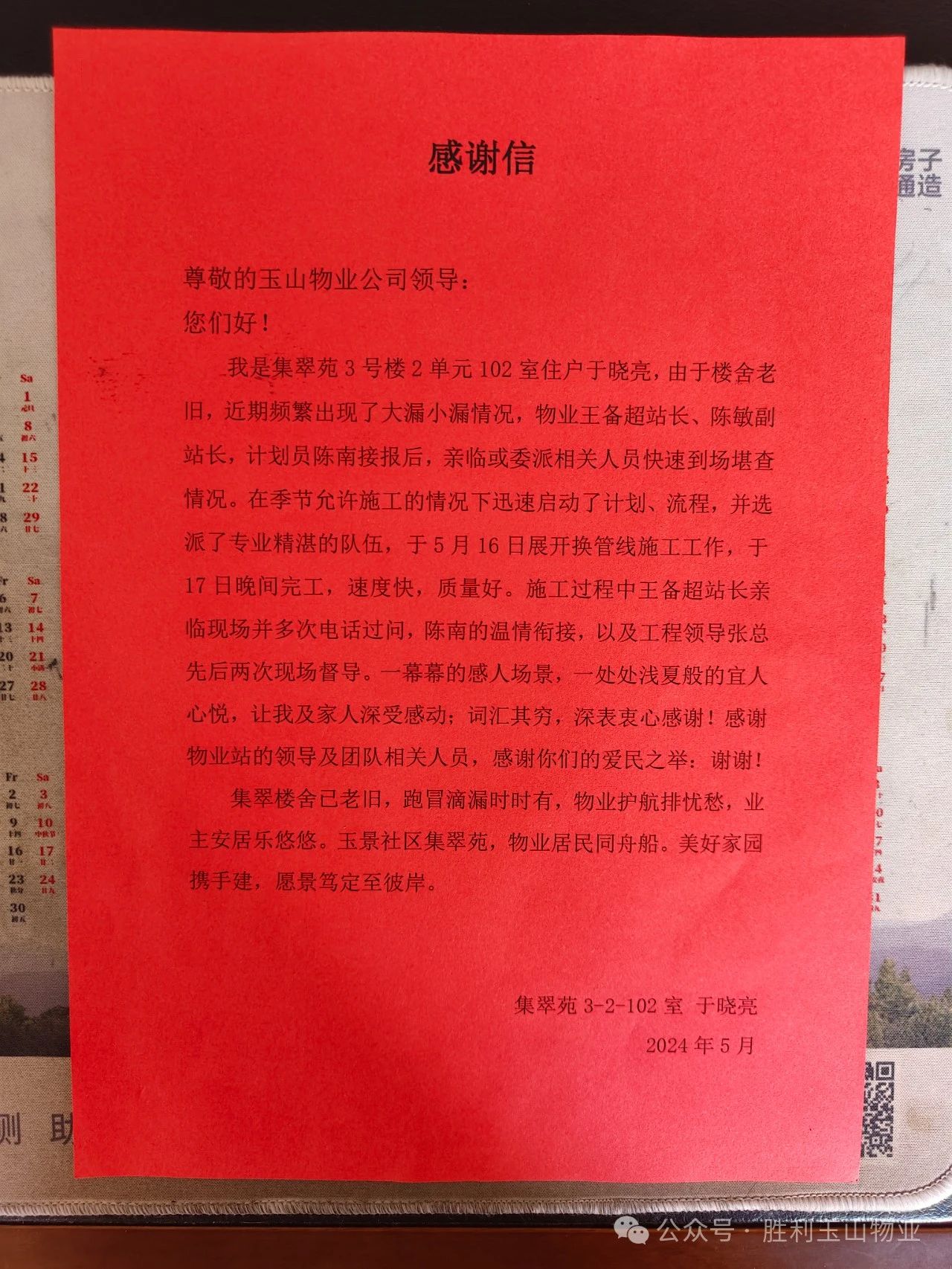 近日,集翠苑小区3号楼2单元的居民于师傅向胜利玉山物业物华事业部玉景项目的物业工作人员表达了深深的感谢。困扰居民的污水渗漏问题在物业的积极协调和跟进施工维修下得到了圆满解决,于师傅特意送来感谢信,对物业工作人员的高效与专业表示赞赏。