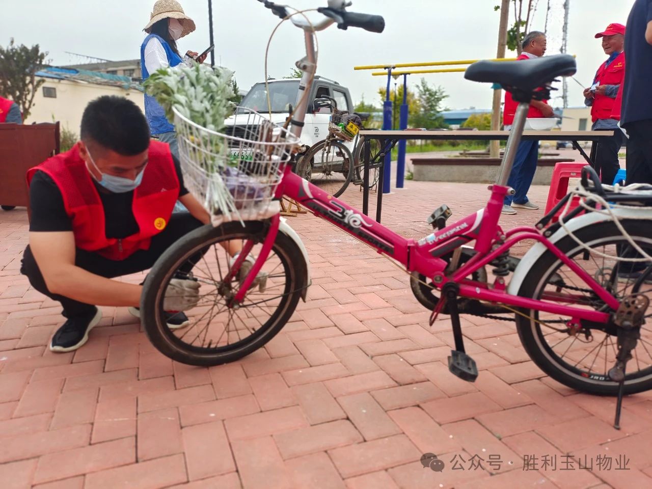 在便民服务区,志愿者们同样忙碌,提供自行车(三轮车)修理、血压测量、擦皮鞋、清洗眼镜等便民服务,并分发各类宣传资料。这些多样化的服务为居民们带来了实实在在的便利,也让清晨的文化广场充满了活力与温暖。