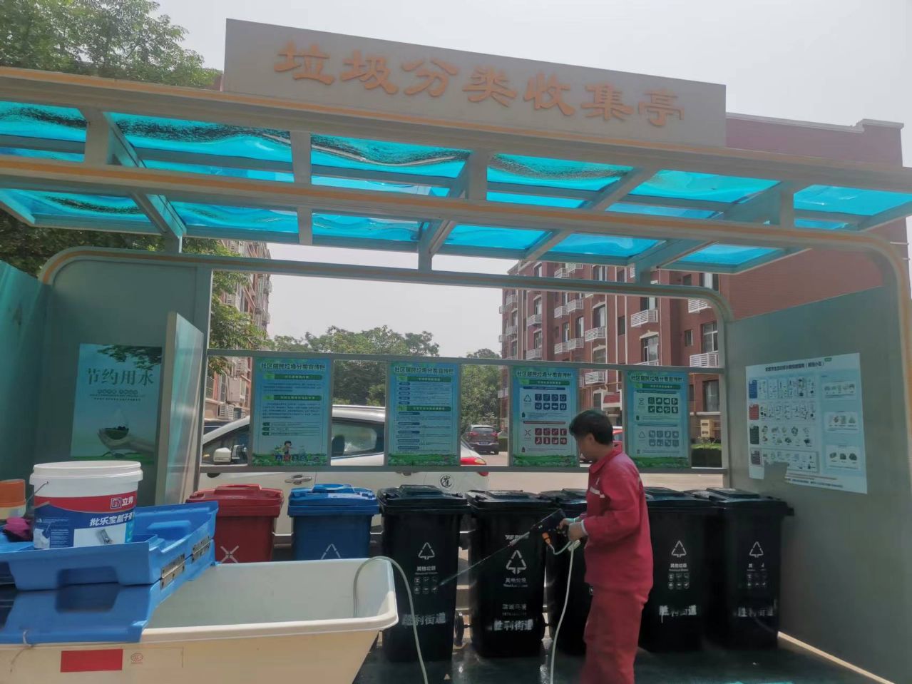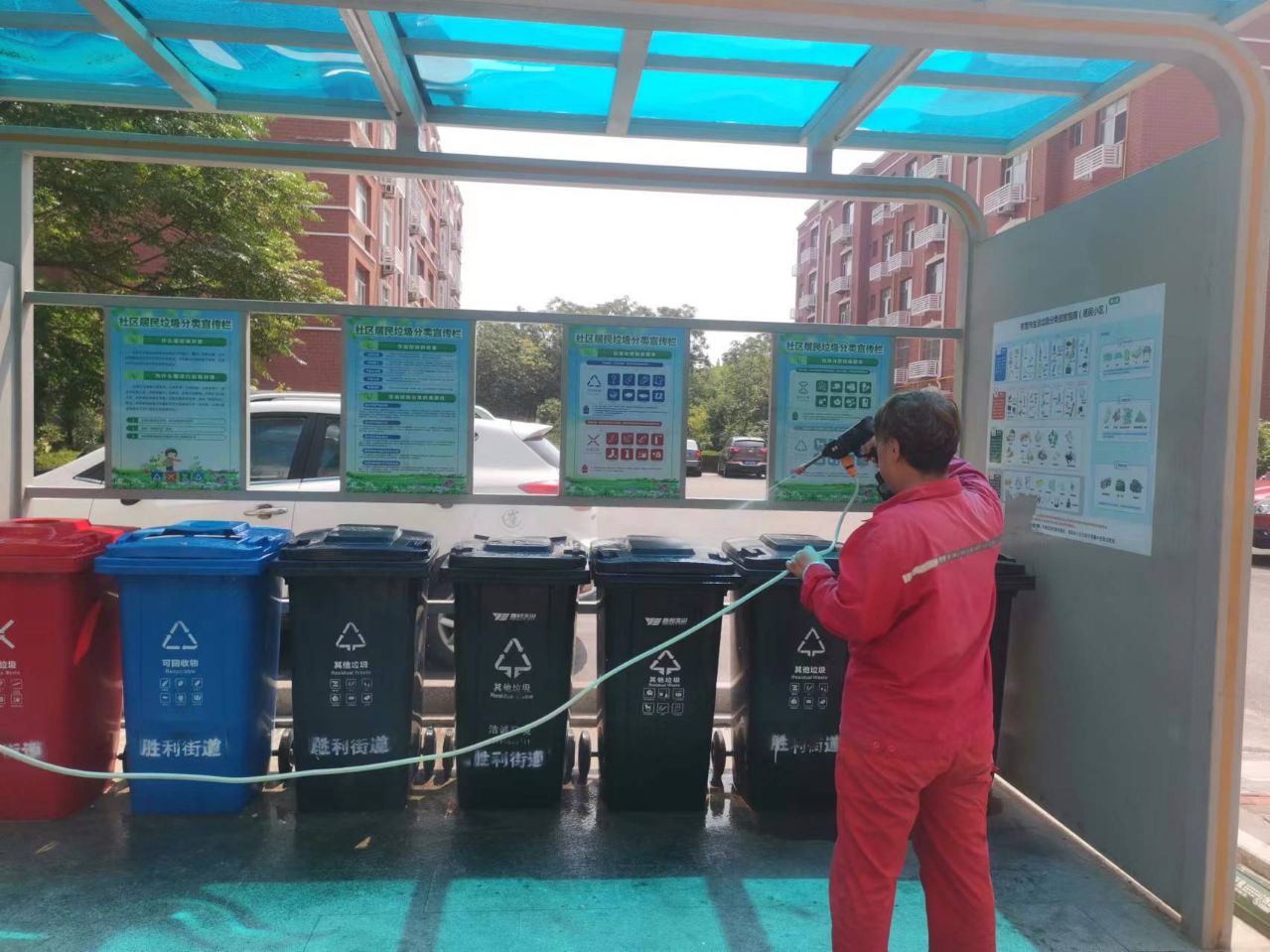 近几日连续下雨,高温潮湿环境会导致垃圾的腐坏速度加快,为了保证小区垃圾点在雨后干净整洁,锦华事业部要求工作人员加强垃圾点保洁力度。保洁过程中,工作人员先用高压水枪对垃圾桶进行冲洗,再用干净抹布擦拭干净,清洗完后做好打药消杀工作。