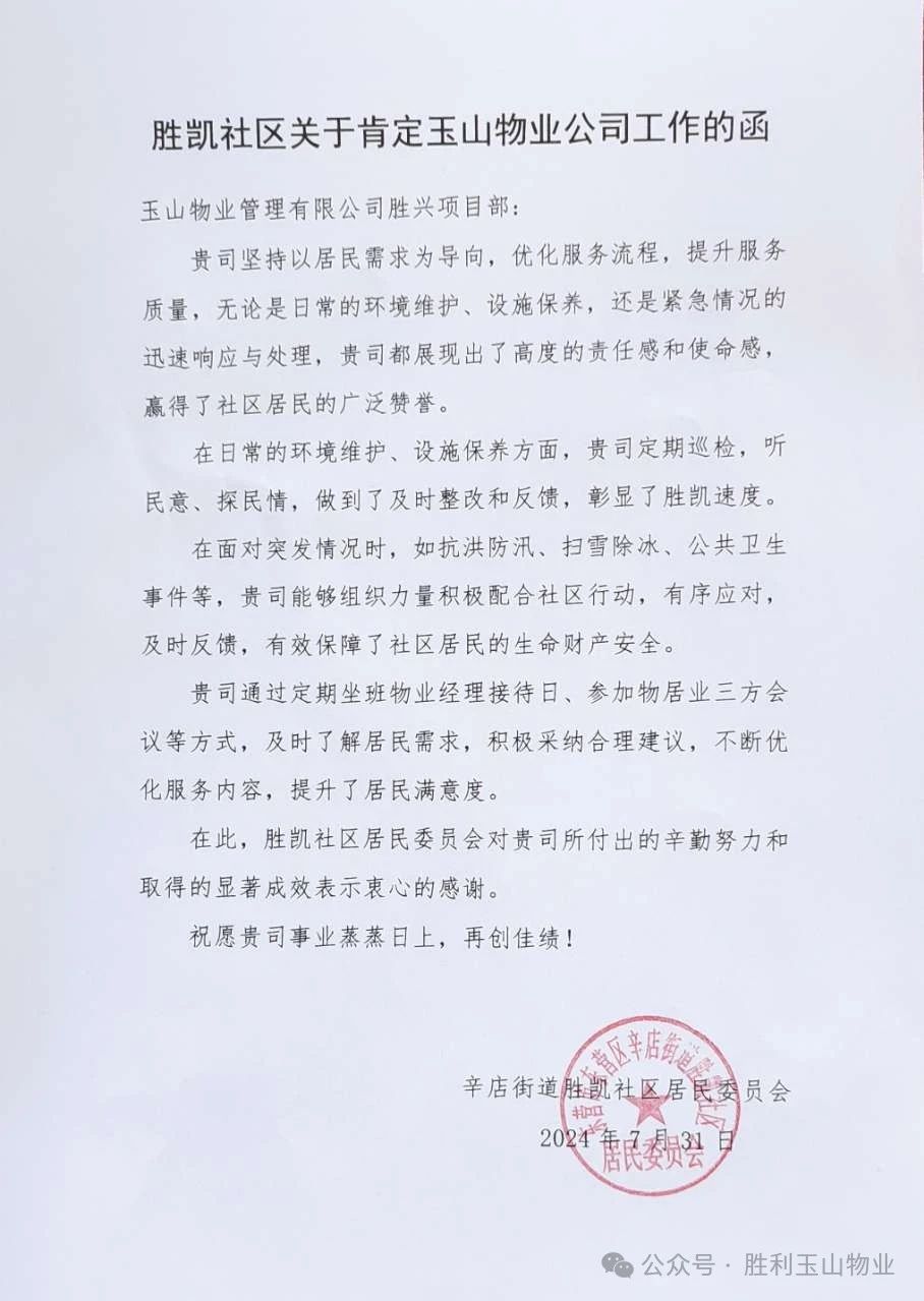 此次工作肯定函的颁发,既是对胜兴事业部过往工作的认可与赞扬,也是对未来发展的期许与鞭策。我们有理由相信,在社区与物业的携手并进下,胜凯社区的服务水平将持续攀升,为居民打造一个更加和谐、舒适、美好的居住环境。