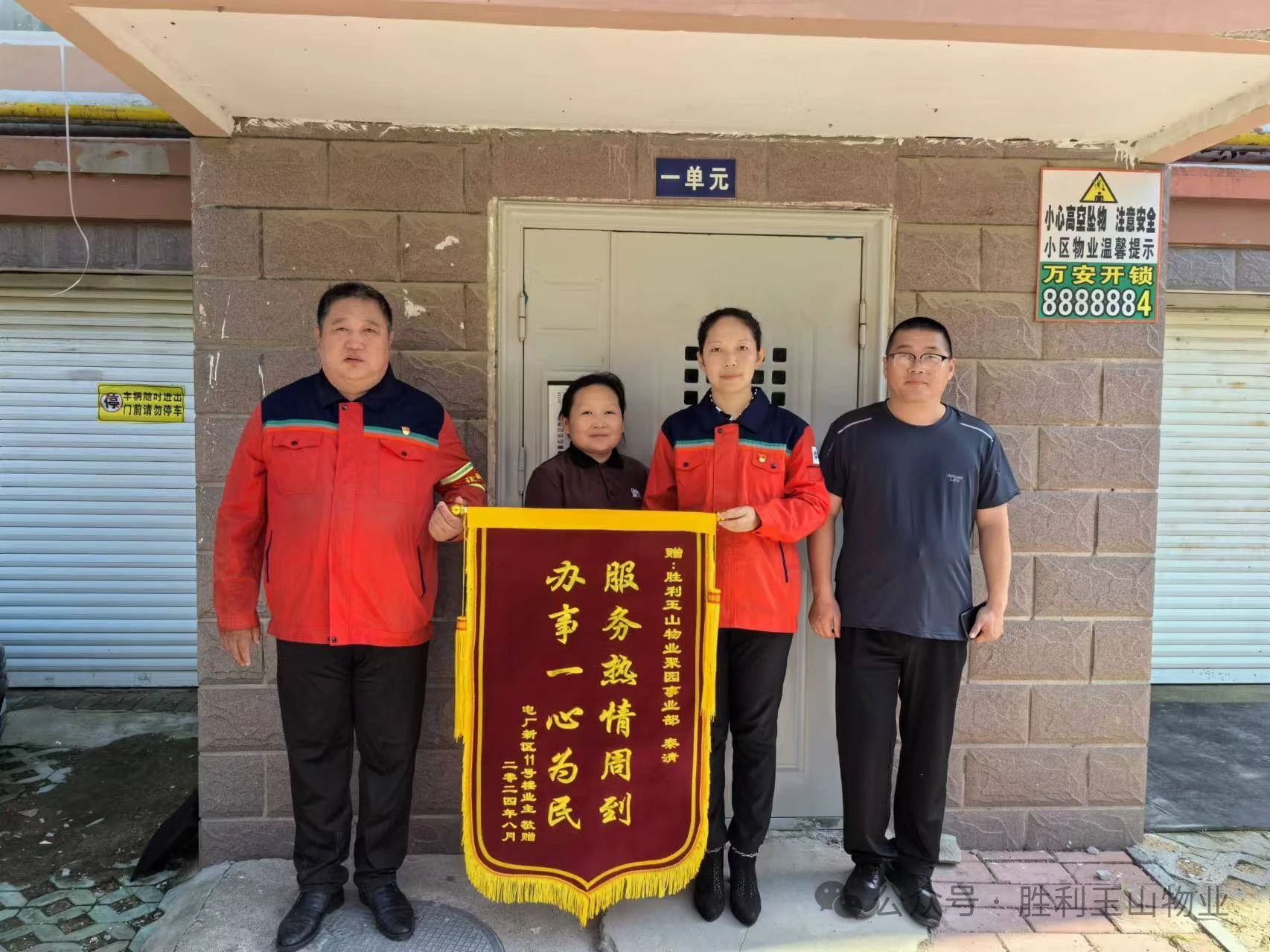 8月11日中午,电厂新区11号楼的居民满怀感激地向聚园事业部阳城项目的秦清赠送了一面鲜艳的锦旗。