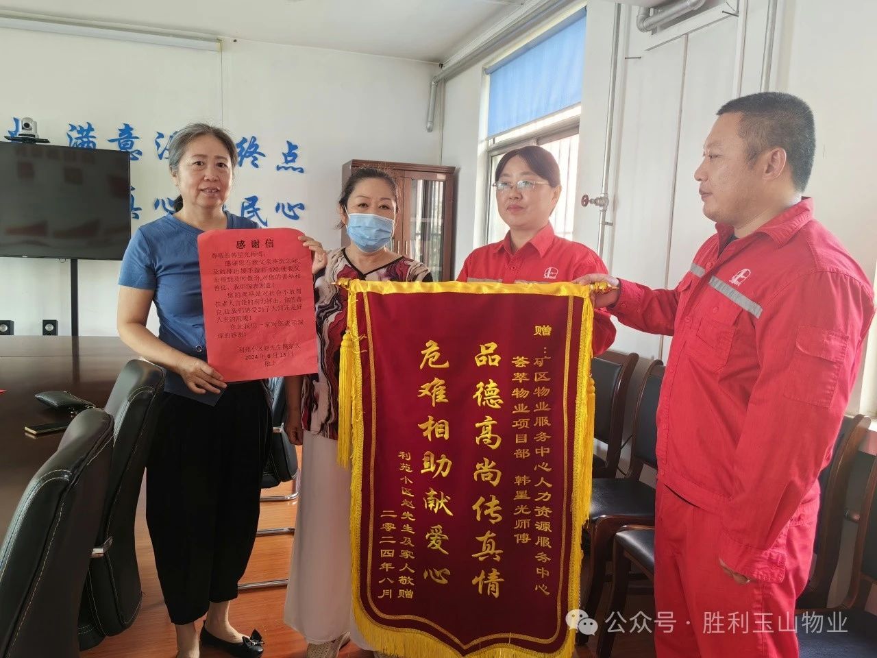 8月13日上午,胜利玉山物业荟萃事业部迎来了两位居民,她们手捧锦旗与表扬信,专程前来致谢:“真的太感谢你们了!我父亲已逾九旬,言语不畅,不慎跌倒后无法自行起身,幸好有你们的及时援手,否则后果真的难以想象!”言毕,她紧紧握住项目经理张秋季的手,感谢物业培养了这么优秀的职工。