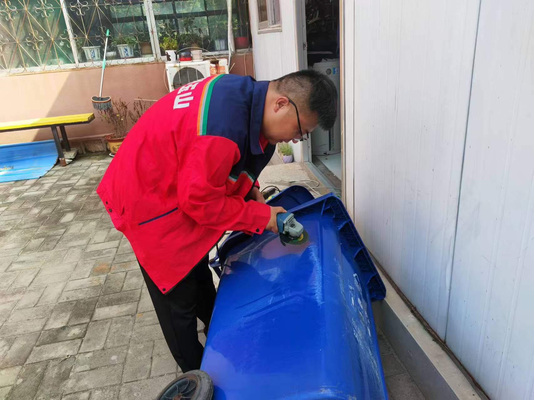 说干就干,他俩立刻找来合适的工具、材料忙活起来,分解拼凑、加固焊接,切割打磨,在他俩的巧手下,用微小的成本就可以使价值300多元的垃圾桶重新上岗,既降低了成本,又杜绝了浪费,真正把节约意识落实到实际工作中,让破损的垃圾桶重获新生,再次投入使用。