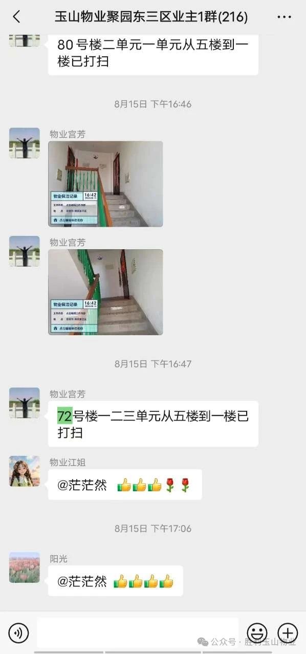通过将清扫成果直观展现于业主眼前,东项目不仅让业主们切实感受到了物业服务的辛勤努力与不懈付出,更为业主搭建了一个便捷有效的监督平台。业主们只需轻点指尖,即可随时浏览照片,对楼道卫生状况进行直观评价与积极反馈。一旦收到业主的宝贵意见或发现的问题,物业团队将迅速响应,立即着手整改,确保楼道环境持续保持在高标准状态。