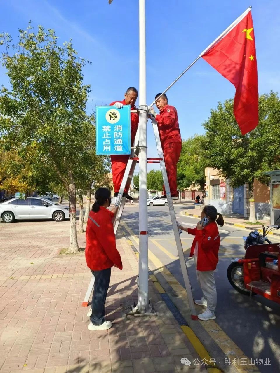 景安事业部提前规划国旗悬挂方案,在小区大门口及主干道路灯杆上悬挂国旗,以这种特殊的方式迎接祖国华诞。同时,事业部还在辖区内开展公共场所美化亮化及环境整治活动,全面检修公共设施,组织员工进行彻底清扫,美化环境,确保小区整洁有序、路灯明亮。