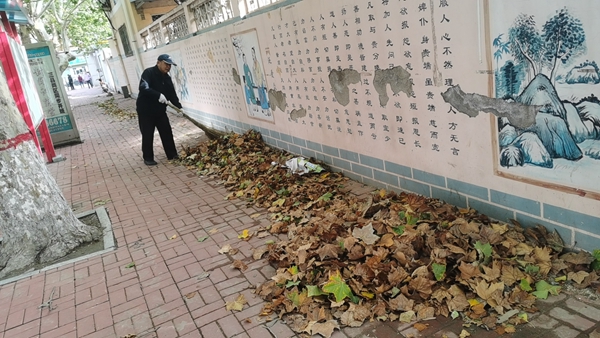 18日一场强风降雨后,天气骤然转凉,萧萧黄叶纷纷落下。遍地的落叶严重影响小区环境面貌和居民出行。19日一早,胜利玉山物业桐凤事业部积极行动,进行落叶清扫工作。