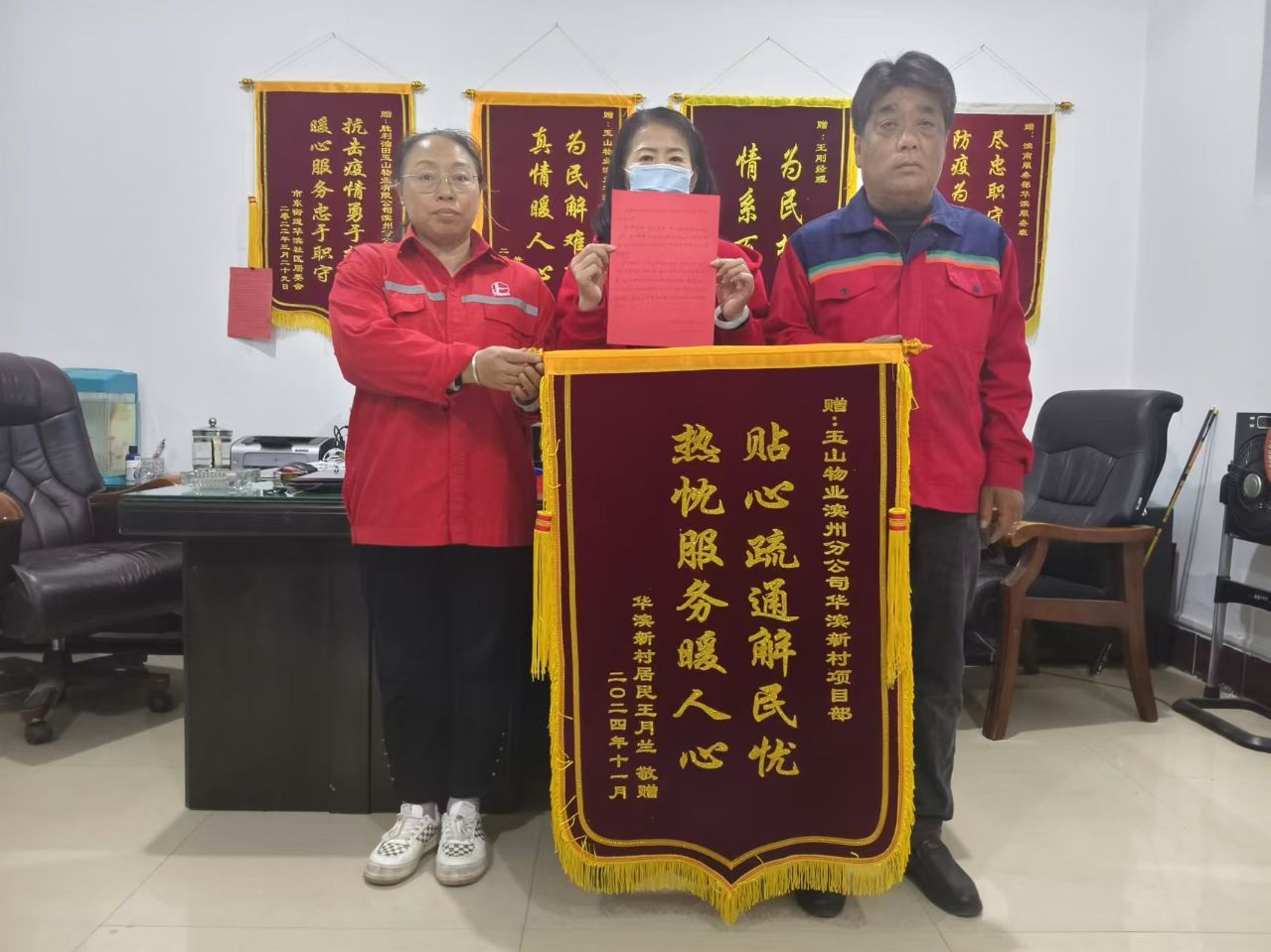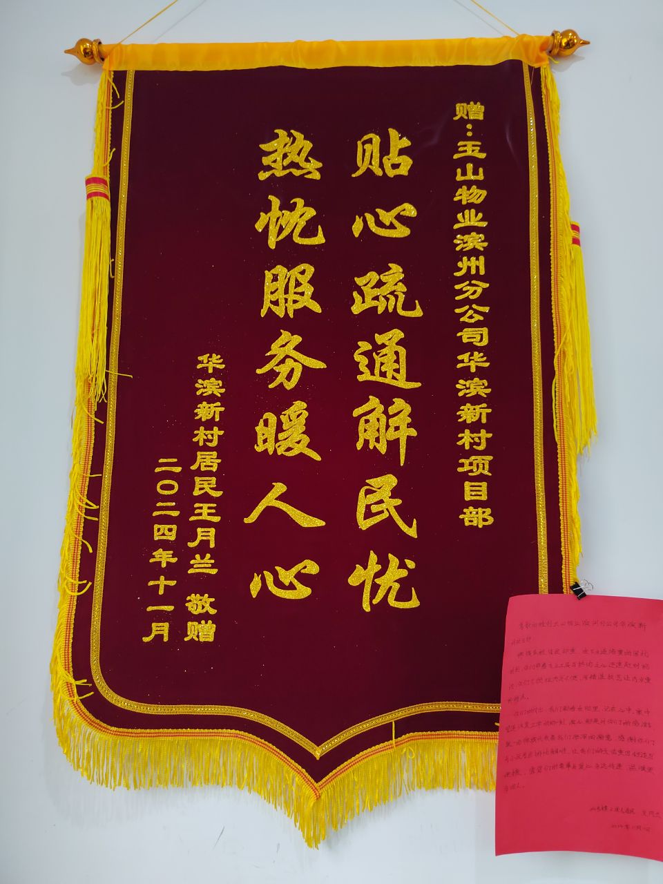 近日,滨州分公司所辖华滨新村24号楼2单元下水道堵塞的难题在华滨项目工作人员的努力下得到了圆满解决,小区居民为此特意送上了一封表扬信和锦旗以表感谢。