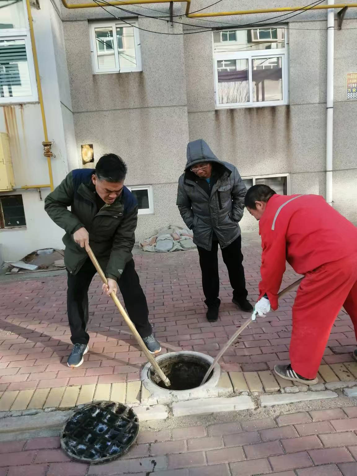 张活常立即回到工棚,用三轮车拉来了铁镐、铁锨、竹批子、PVC疏通管等。他首先用铁镐将井盖打开,发现观察井内淤积的污物离井口只有20多公分,可以说淤积物堵满了整个观察井。为了不影响业主今天晚上的日常排水所需,张活常与瑞景项目经理张健2人一起对淤积的污物进行清理。张健用铁锨往外挖,张活常就用竹批子往下捅,经过20多分钟,观察井内淤积的污物清理干净了。为了让污水排的更加通畅,张活常又用竹批子分别对通往居民住宅楼的排污管和通往化粪池的排污管道进行疏通。通过疏通,发现通往化粪池方向管道内的油污因天冷或时间长久已经结蜡且变得非常坚硬,同时靠近观察井距离30公分左右的地方还有施工队当年施工改造遗留的一装有碎石砖块的编织袋。张活常他们通过铁镐、手拽等方式把编织袋拖了出来。为了彻底将该管道清理干净,又用高压水车进行了冲洗。至此,35号楼一单元的污排观察井及污排管线终于被清理干净了。