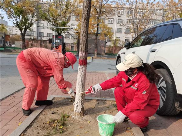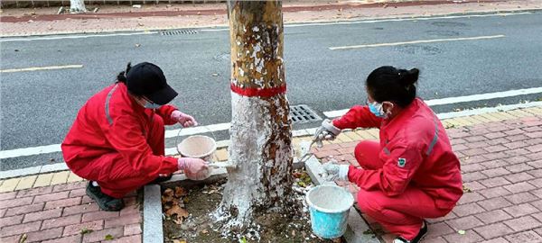 所有项目针对小区2800余棵树木进行涂白,大家携带手套、油漆桶、石灰浆、刷子等工具,摇身变成“粉刷匠”,将搅拌好的石灰浆细致地涂抹在树干上,并对树皮缝隙、空洞等处进行反复涂刷。