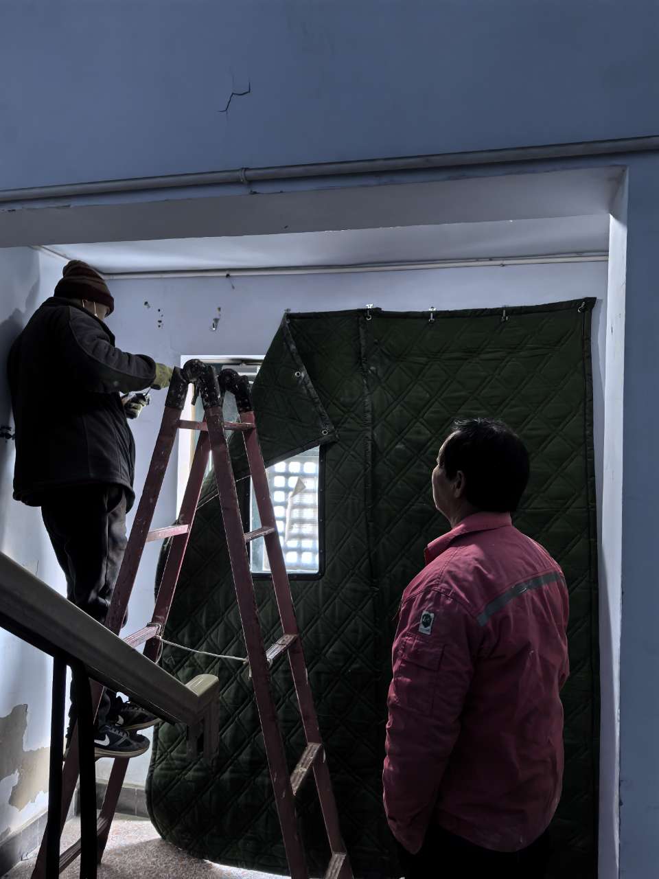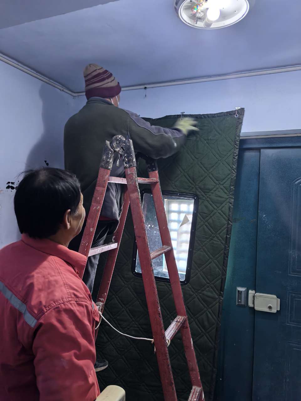 为了防止高层内的消防水管道冻裂,确保小区居民安全、温暖过冬,近日,滨州分公司建翔项目为小区高层楼道门口安装上了棉门帘,用实际行动做好冬防保温工作。