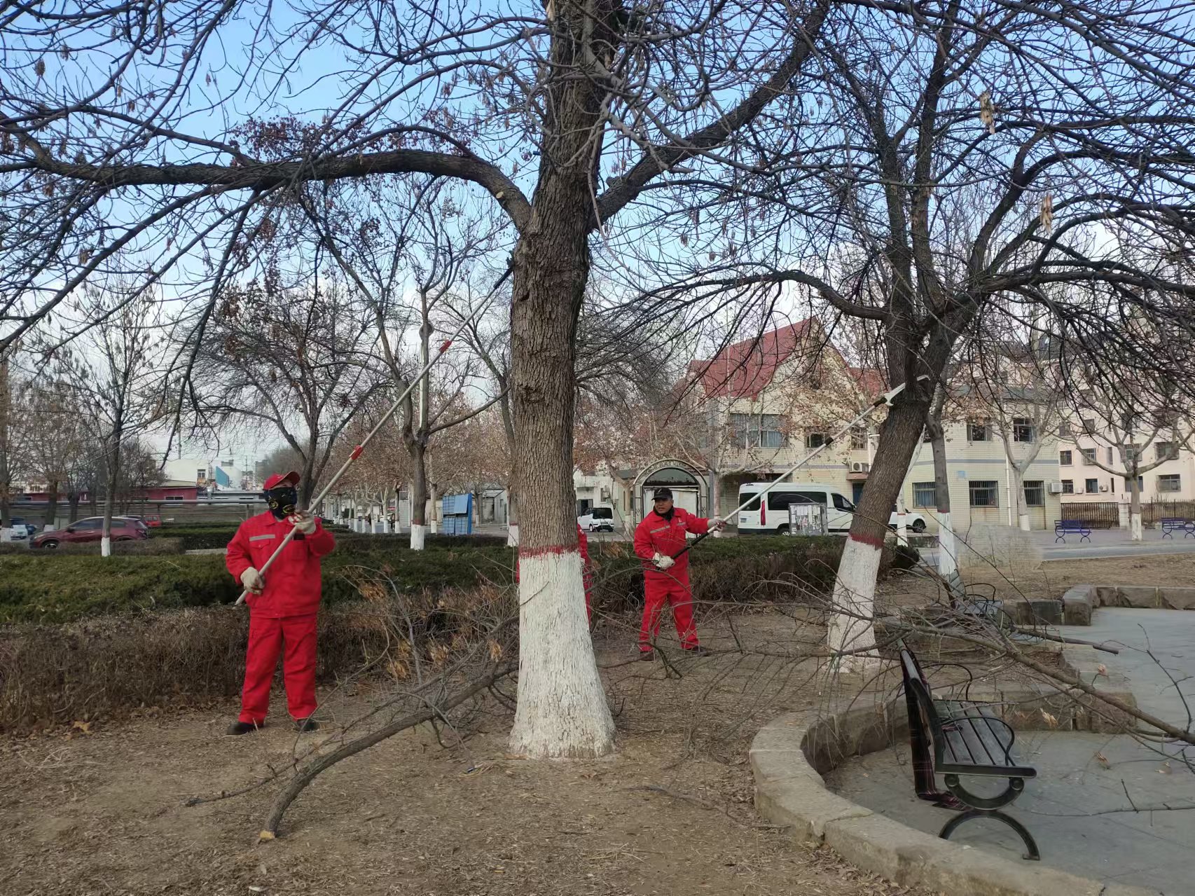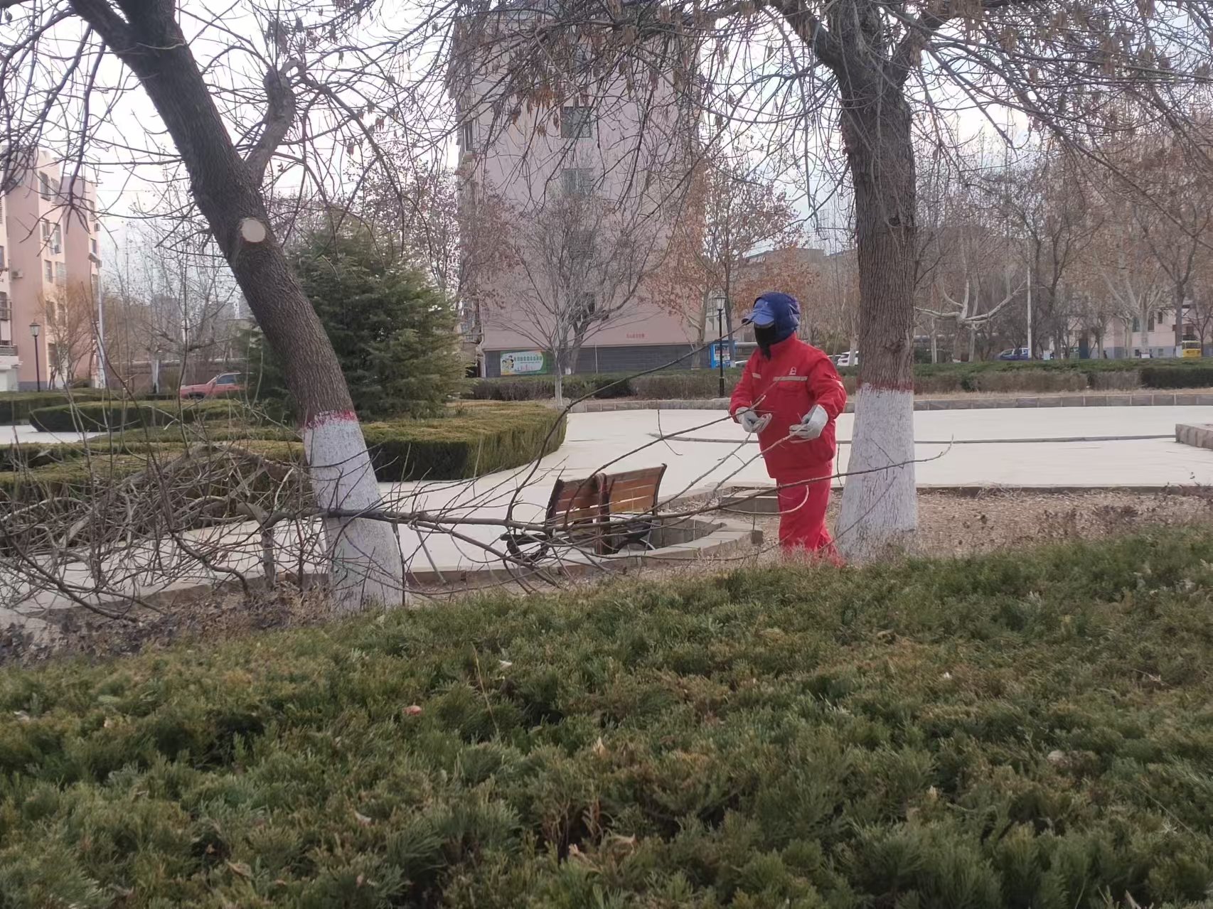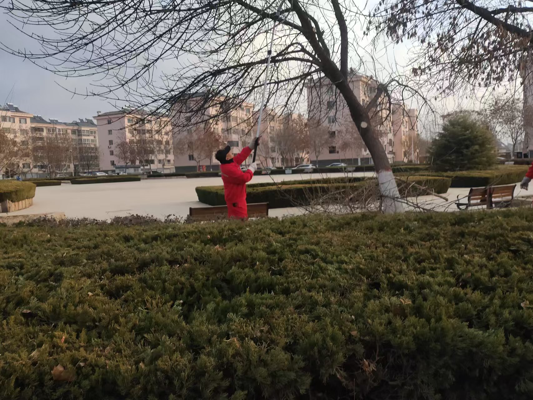 滨州分公司建翔项目在小区巡视中,现建翔东区广场及部分楼间树枝过于低垂影响美观也妨碍居民出行,立即组织人员进行修剪。