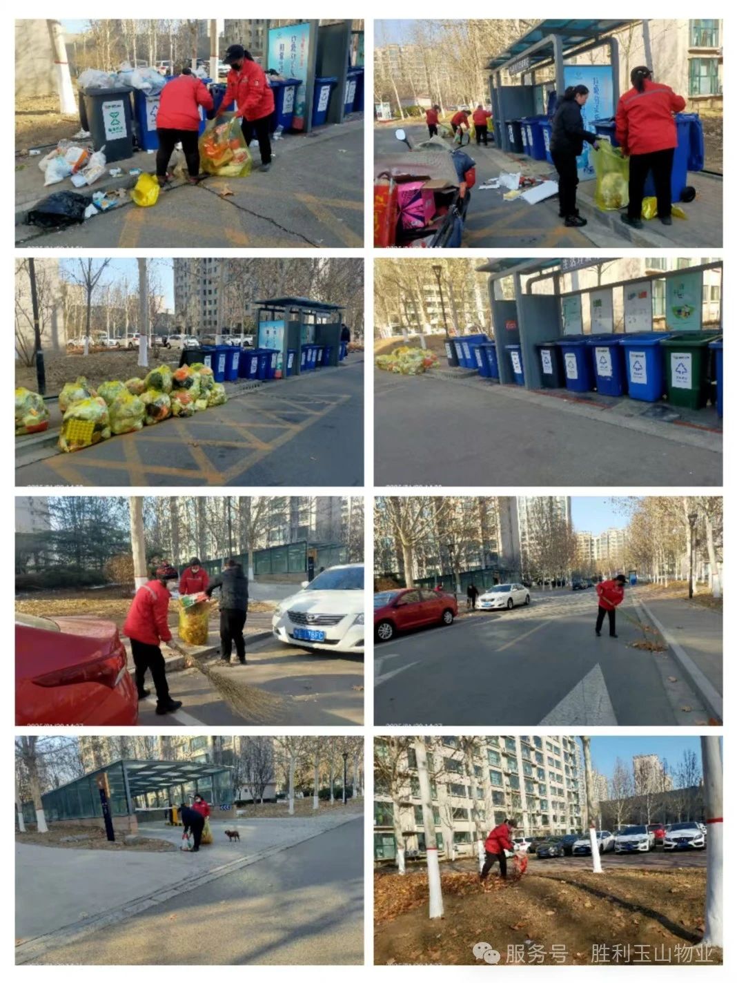 大年初一下午,胜利玉山物业胜利花苑事业部百合项目的室外保洁人员早早地来到了工作岗位。她们发现由于春节期间居民走亲访友、聚餐聚会增多,丁香园和百合园垃圾点的垃圾量过大,导致垃圾桶外溢及地上散落的垃圾过多,面对这一情况,保洁人员没有丝毫抱怨,迅速投入到清理工作中,对于垃圾桶周边散落的垃圾,保洁人员也一一进行了清扫,她们集中清理了12处垃圾点的垃圾,清理完成后并对主路的路面进行了清扫。