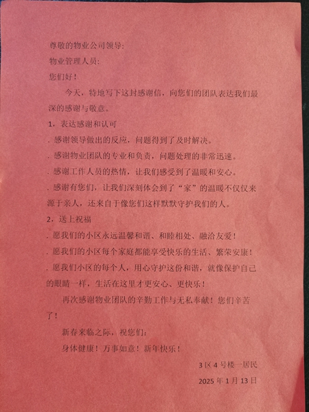 近日,胜利玉山物业桐凤事业部南苑小区物业负责人刘波收到小区居民送来一封表扬信。该居民对刘波积极调解邻里纠纷、并热心帮助两家解决问题,最终双方达成和解的担当和热情,表达了自己的感激之情。