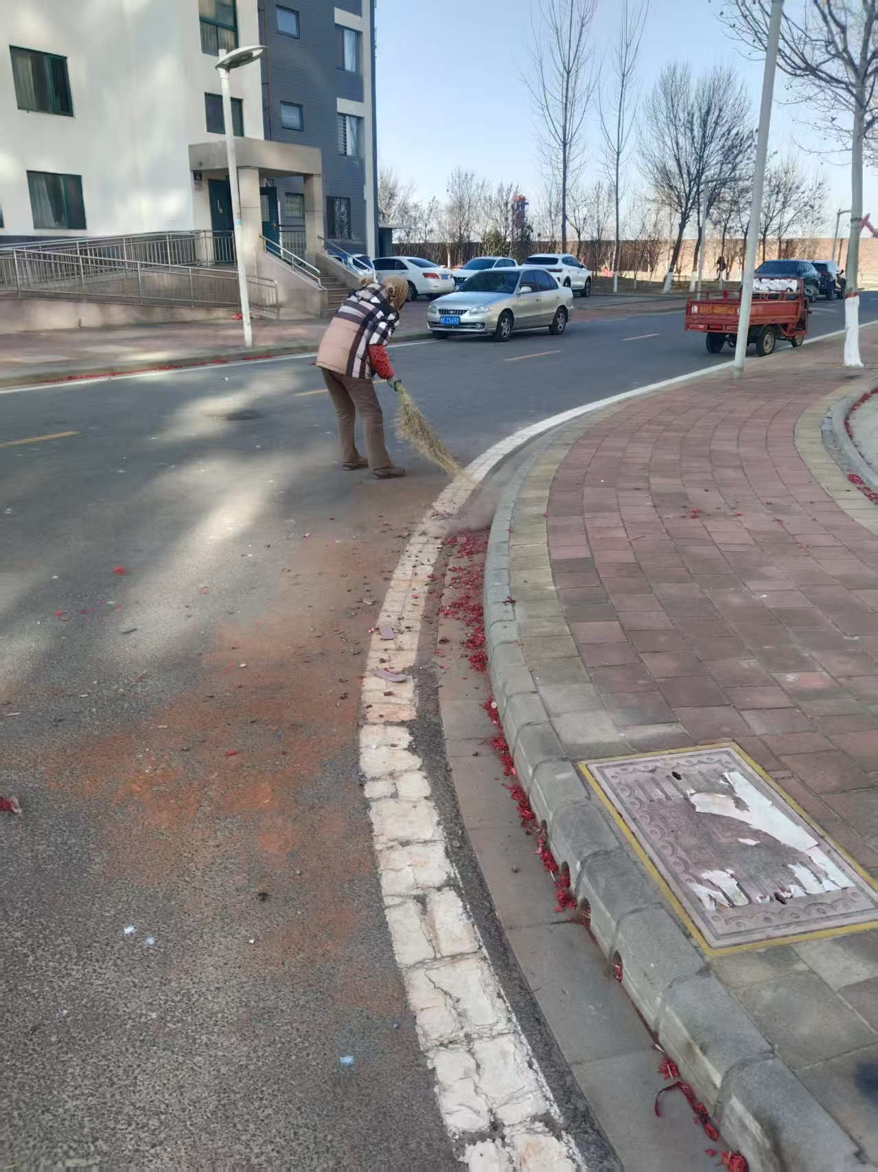 然而,热闹喜庆之后,大量的爆竹皮、礼花残骸散落在小区的各个角落。这些垃圾不仅影响小区的美观,还存在一定的安全隐患。景苑事业部敏锐地意识到问题的紧迫性,不等不靠,在节日后的清晨,天刚蒙蒙亮,环卫工人就已早早集合完毕。他们精神抖擞,丝毫没有被节日期间的疲惫所影响,每个人的脸上都写满了认真与负责。纷纷拿起扫帚、铲子、垃圾袋等清洁工具,奔赴小区的各个角落。在清扫过程中,他们分工明确,配合得十分默契。负责主干道清扫的人员,挥动着扫帚,动作娴熟而有力,将厚厚的一层爆竹皮快速地聚集在一起,再用铲子仔细地铲入垃圾袋。负责清运垃圾的人员,驾驶着垃圾车来回穿梭,及时将装满垃圾的袋子运走,确保清扫现场不会出现垃圾堆积的情况。