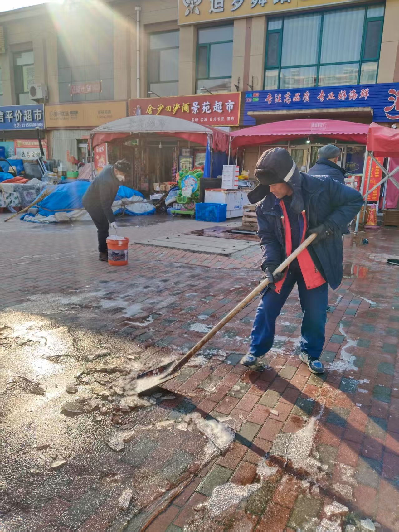 放下店主电话后,王强火速反应,第一时间组织人员奔赴现场。环卫保洁人员冲在最前,他们不畏严寒,手持扫帚、推雪板,全力清扫积水。由于部分积水已结冰,清理难度增大,他们又拿起铁铲,一点点铲除冰层。寒风吹过,冰冷刺骨,大家的脸被冻得通红,双手也失去知觉,但没有一人退缩。