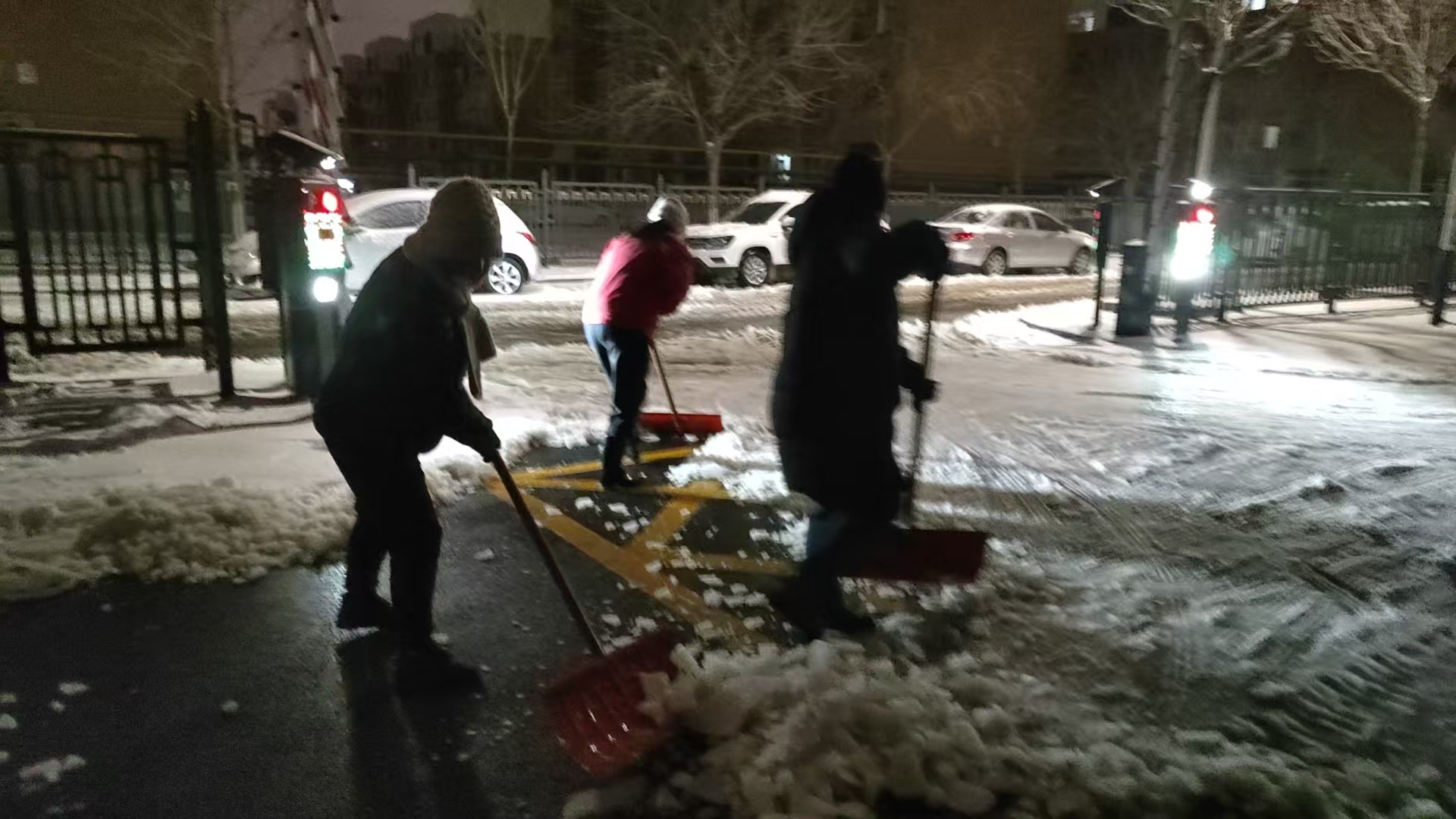 雪情就是命令。自2号上午10点半左右,天空中的飘落的雪花越来越大,辛兴事业部经理郝志涛、副经理白洪东等来到项目部办公室关注着雪情变化并通过微信工作群,要求各项目关注积雪情况、提醒业主出门注意安全。同时与东营市地方物业公司联系好了铲雪车,部分员工也在单位待命。下午5点50分左右,看着飘落的雪花越来越小,辛兴事业部正式起动了除雪清雪工作。