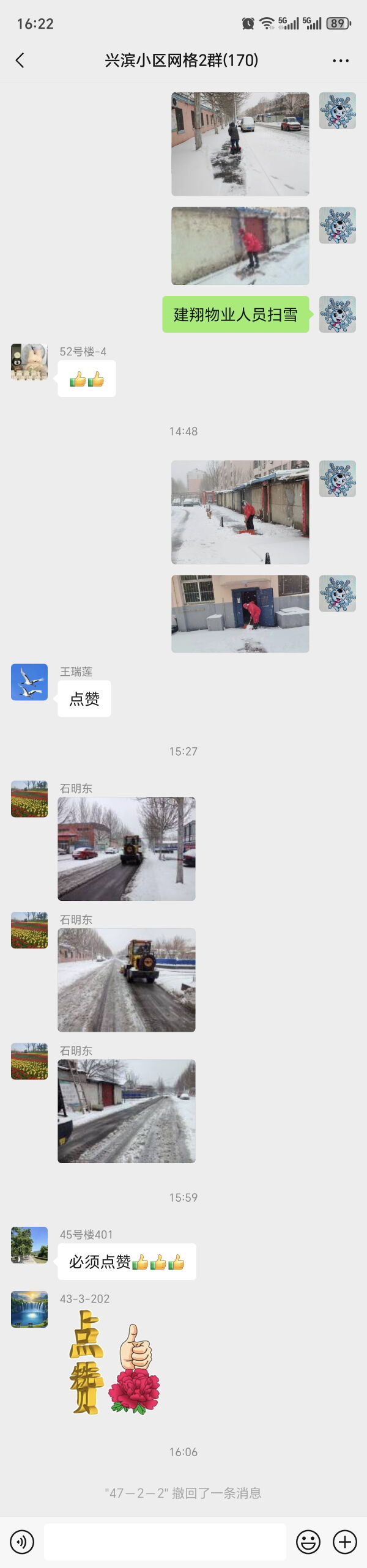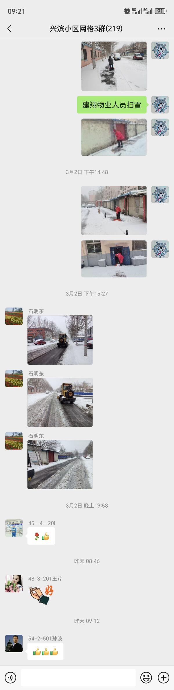 虽已是初春,室外还是零下的气温,不时还刮着风飘着雪,为了居民能够安全出行,大家都是冒着严寒连续与雪冰作战,赶往的居民在路上看到辛勤工作的物业人不住称赞,并在网格群进行点赞。