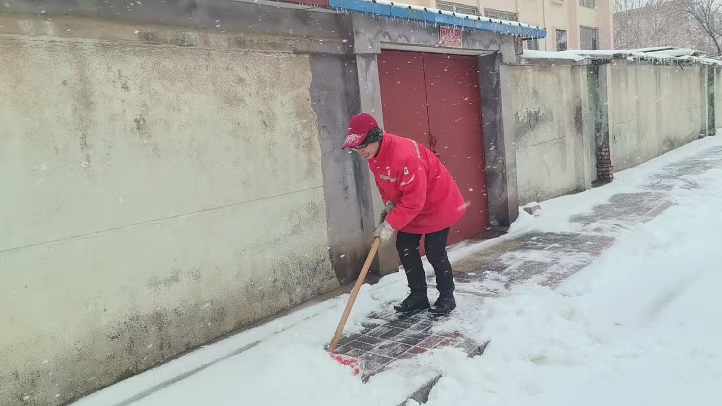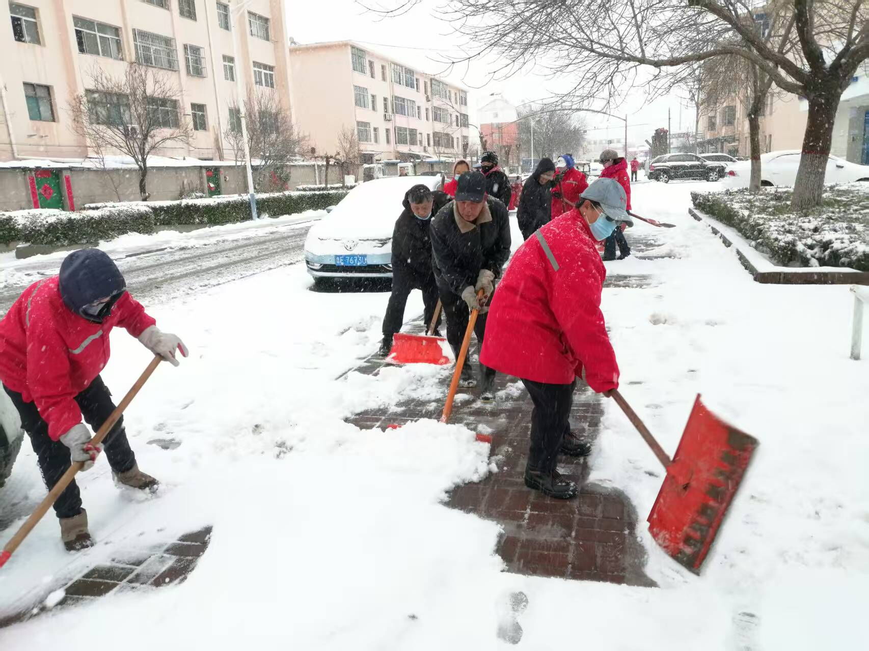 3月2日,他们分别在各小区大门口、主干道上人行道用铲子、铁锹、雪铲不断的清理积雪,保障人员安全出现。