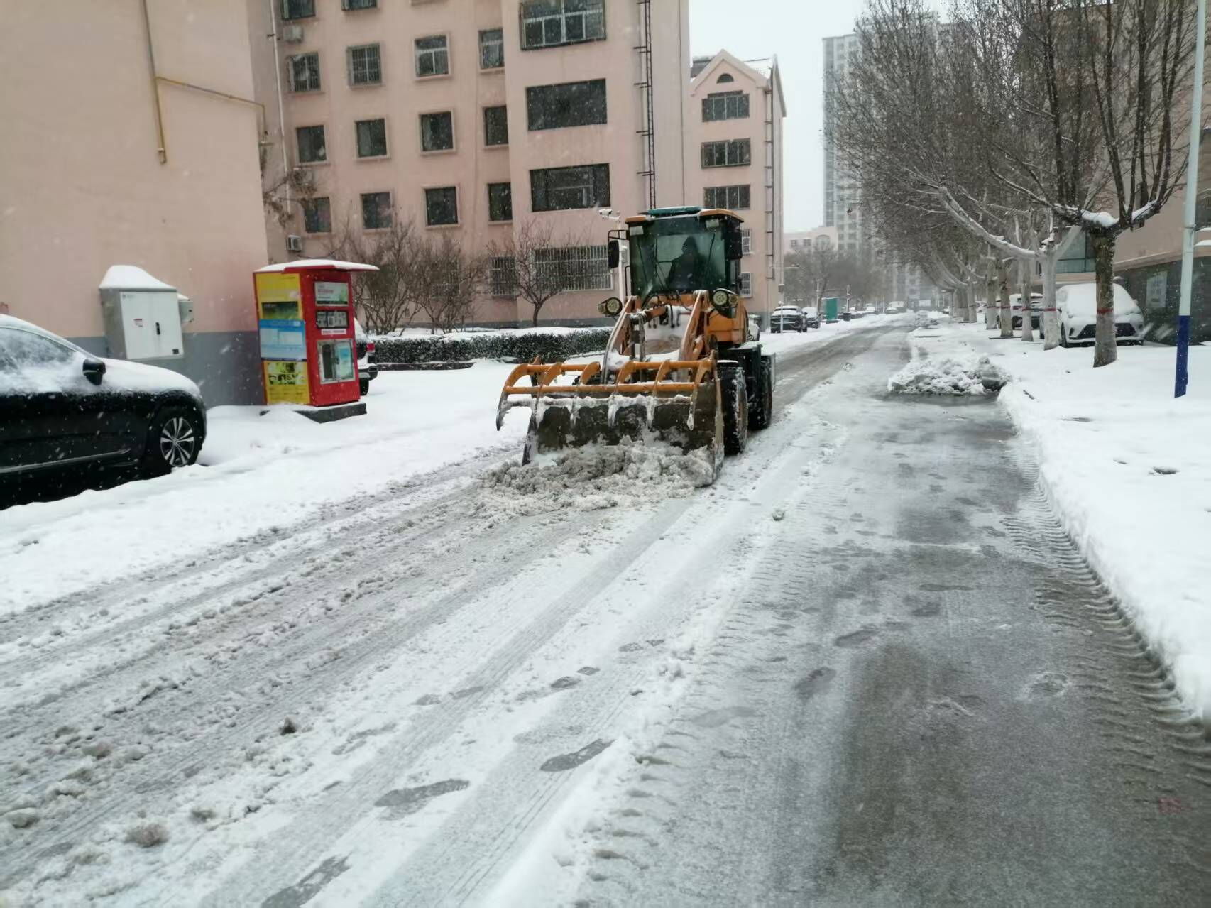 主干道上由铲车机械担当主力来回清理道路积雪,保障车辆安全出行。