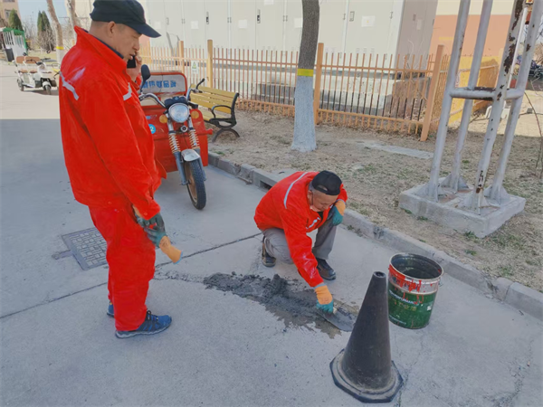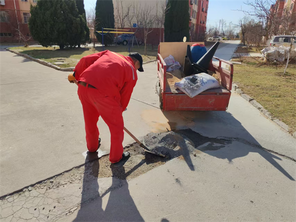 为解决这一问题,在文明项目经理的带领下,物业团队快速响应、主动作为:一方面组织工程人员实地勘测破损情况,制定科学修补方案;另一方面多方协调资源,调运沙石水泥等建材。施工期间,工作人员全程设置醒目标志,引导行人车辆有序绕行,既保障施工安全又最大限度减少对居民生活影响。