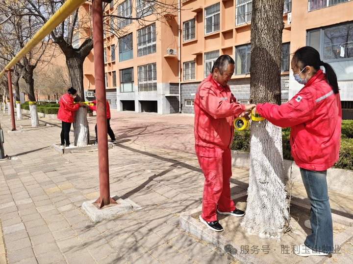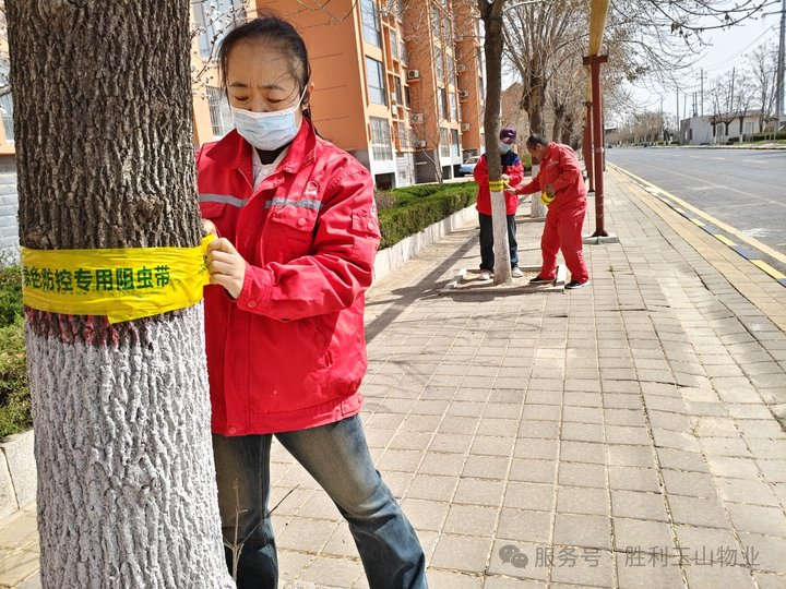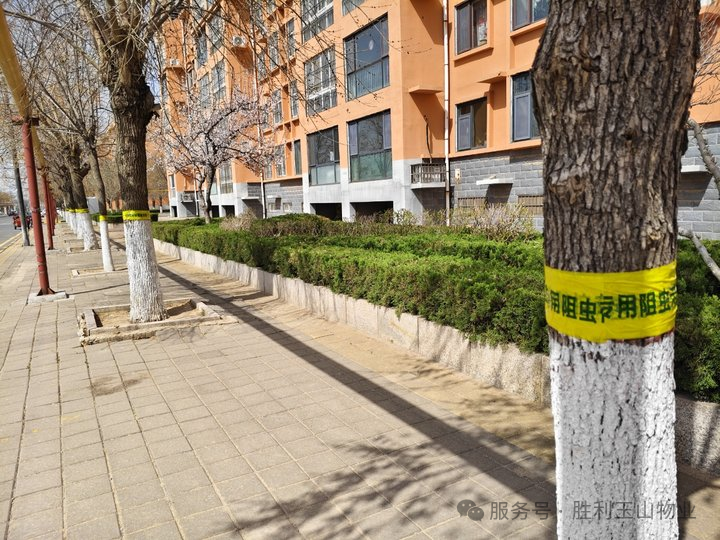 转眼间,阳春三月已至,天气逐渐回暖,万物复苏。惊蛰过后,害虫开始活跃起来。为减少树木虫害的发生,胜利玉山物业景安事业部按照相关要求,对小区内所有树木开展缠胶带防虫害工作。