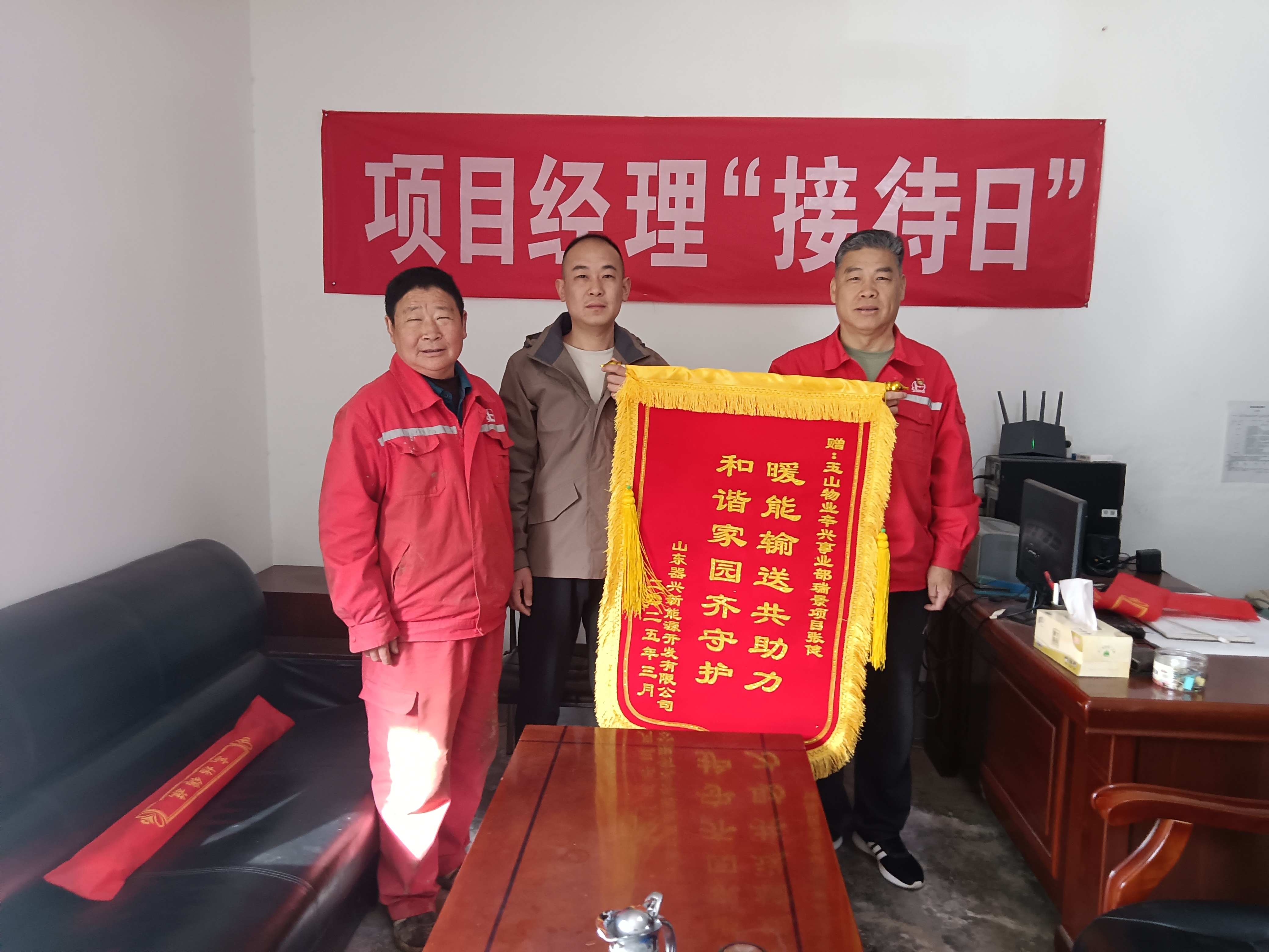 3月24日上午9点左右,胜利玉山物业辛兴事业部瑞景项目经理张健的办公室来了他们熟悉的一个老朋友:山东器兴新能源开发有限公司负责瑞景小区供暖的负责人,他手中还拿着一面写有“和谐家园齐守护 暖能输送共助力”的锦旗。他郑重的用双手把锦旗交到了张健手中,并不停的说着“谢谢”。