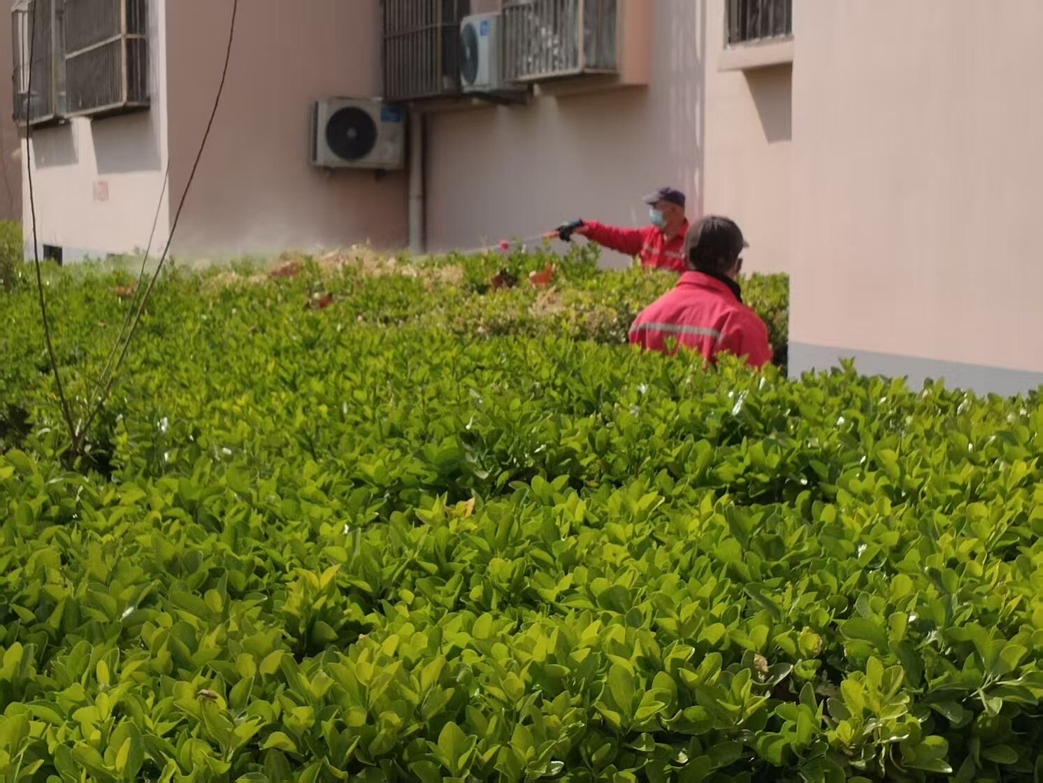 该项目员工先通过网格群等形式向小区居民做好打药宣传让居民做好防范,然后做好员工个人防护并严格按照操作流程,对小区绿植特别是绿化带内的冬青进行全面喷洒,重点对发现有虫害的区域进行认真仔细喷洒确保打药效果。