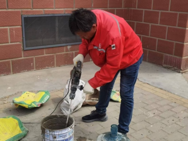据了解,该单元门前路面因长期磨损导致表层起沙,遇风天气易扬尘,雨天则可能湿滑,给居民出行带来不便。物业维修人员接到报修后,立即前往现场勘查,并制定了快速修复方案。为最大限度减少对居民出行的影响,维修人员采用高效修补砂浆进行修复。施工过程中,他们首先用清水冲洗地面,彻底清除浮沙和灰尘,确保基层干净,随后将修补砂浆搅拌均匀,仔细涂抹在起沙区域,使路面恢复平整牢固。
