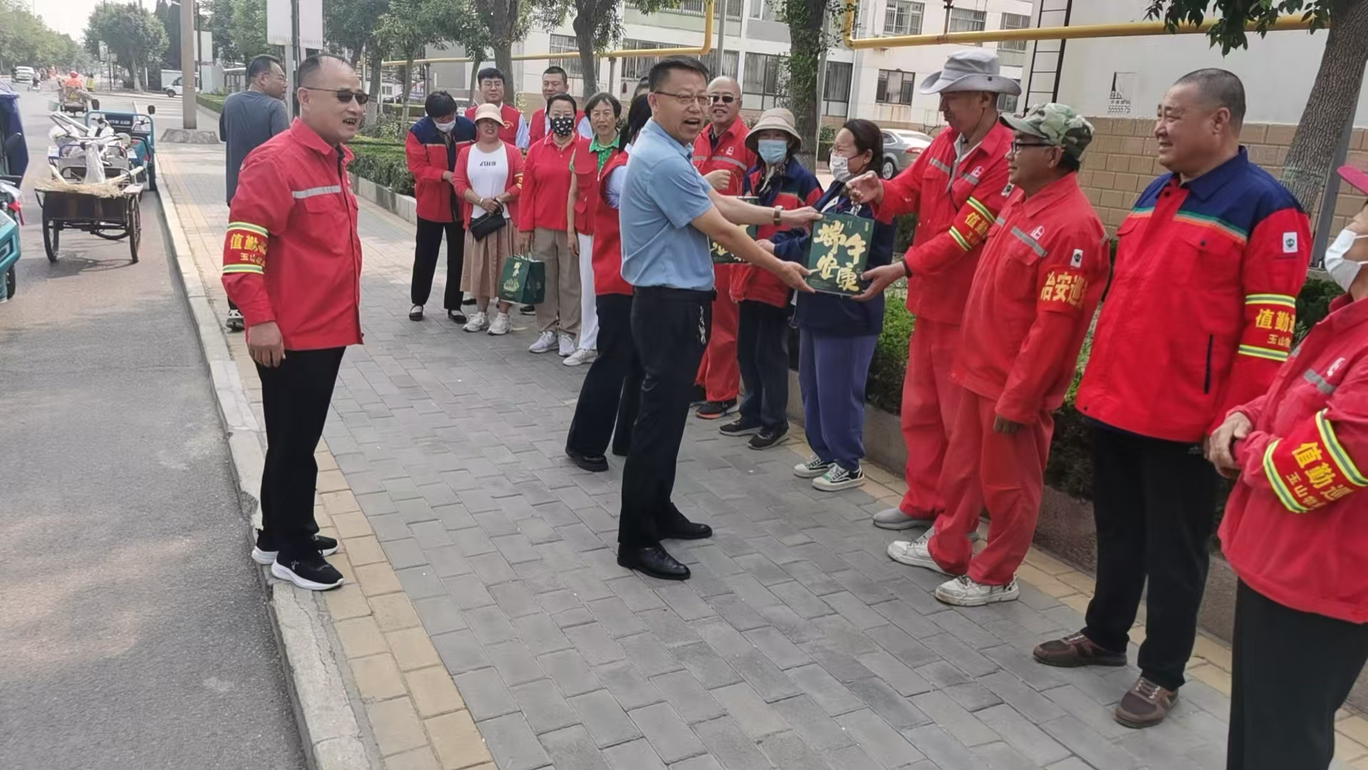 活动现场,钻井北社区居委会书记李兆先带领网格员、业委会成员,手捧满载心意的粽子礼盒走到班前会现场。