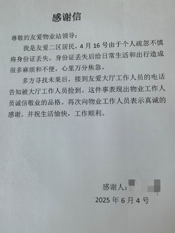 接到物业通知,业主迅速赶到友爱物业大厅。面对失而复得的重要证件,业主深受感动。顺利取回身份证时,业主表示将专程致谢。6月4日,业主送来感谢信,对王文娟拾金不昧、主动作为的高尚品德,以及物业团队展现出的高度诚信与敬业精神,表示高度赞扬与诚挚感谢。